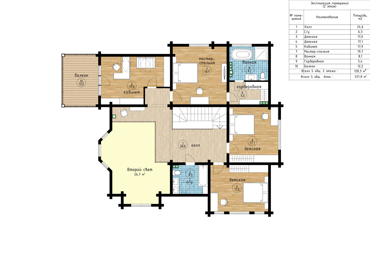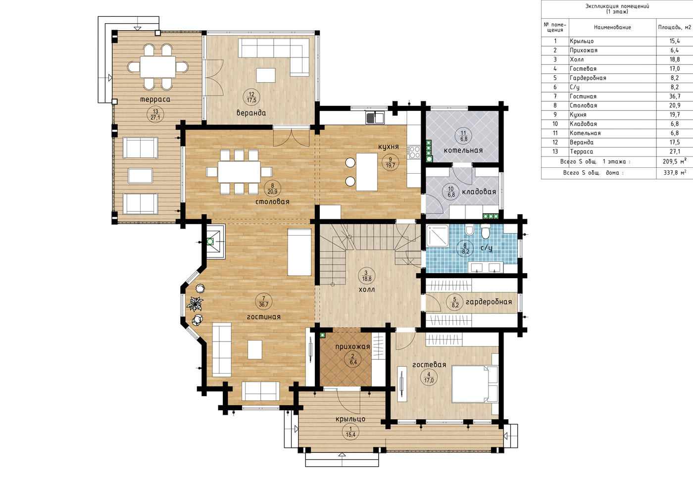 Общая площадь дома – 337,8 м² + второй свет 26,7 м².