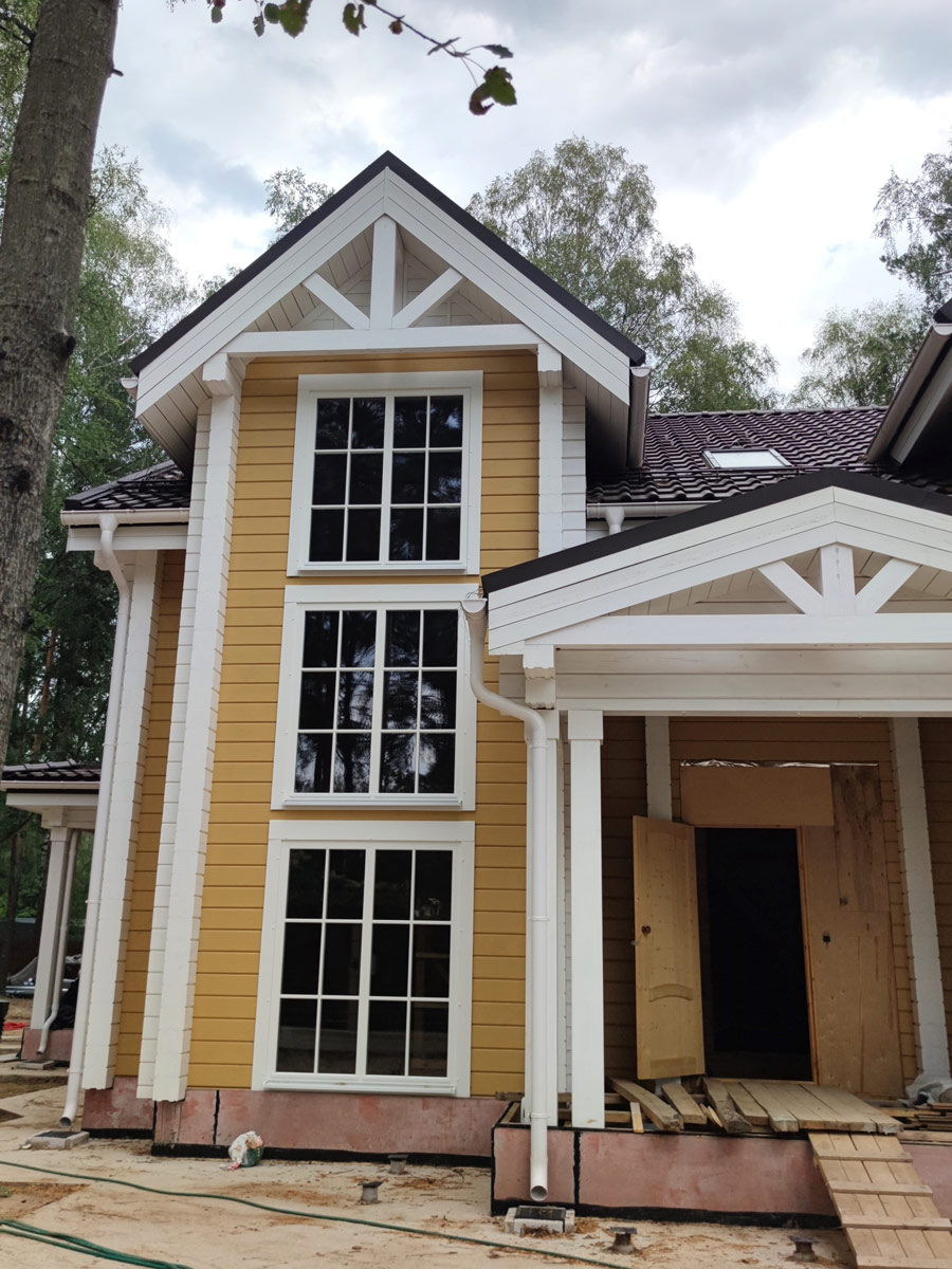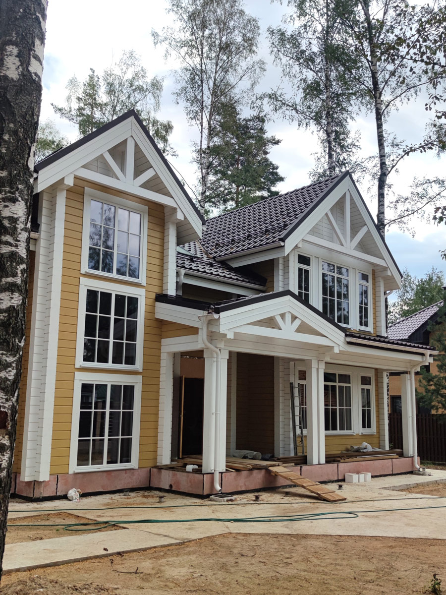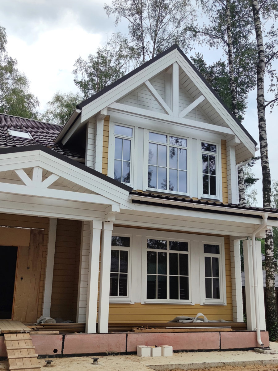 Внешний вид дома сочетает в себе классический и американский стиль архитектуры. Натуральное дерево и теплые оттенки стен в сочетании с белыми окнами, с белыми наличниками, белыми элементами и ограждениями дома, а также белыми углами дома, создают уникальность и индивидуальность фасада.