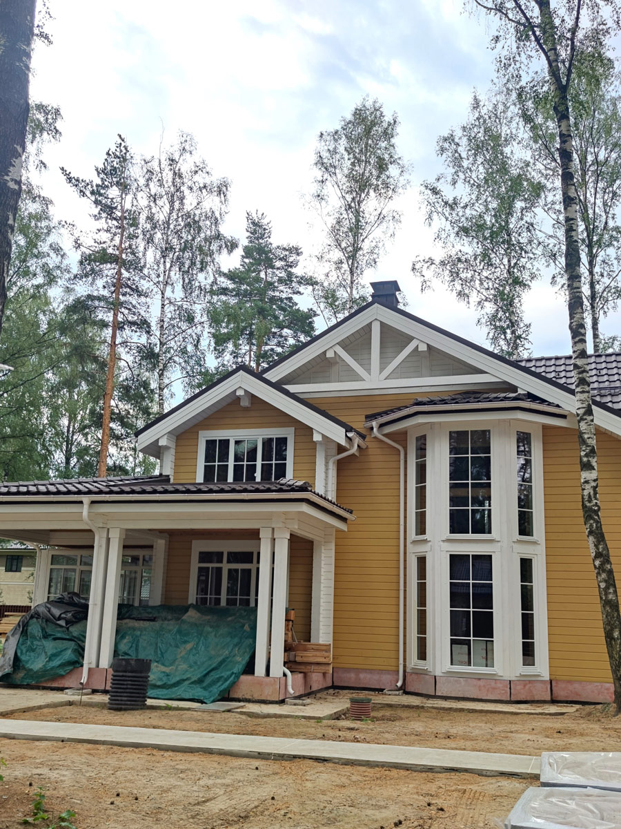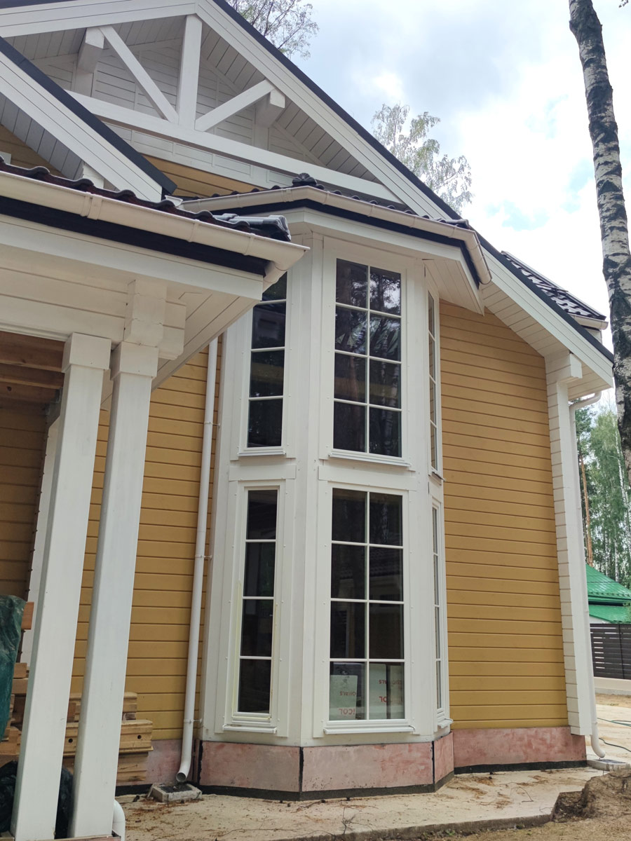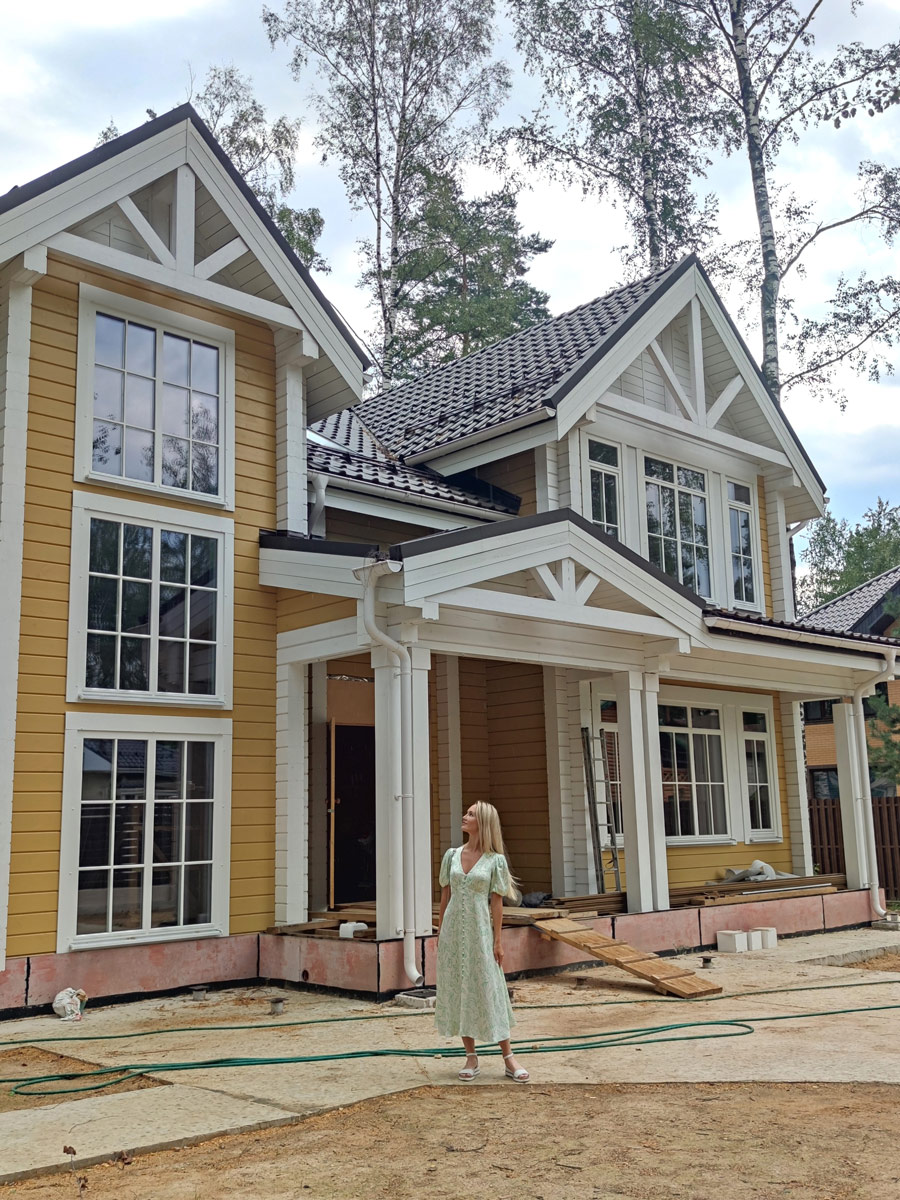 Внешний вид дома сочетает в себе классический и американский стиль архитектуры. Натуральное дерево и теплые оттенки стен в сочетании с белыми окнами, с белыми наличниками, белыми элементами и ограждениями дома, а также белыми углами дома, создают уникальность и индивидуальность фасада.