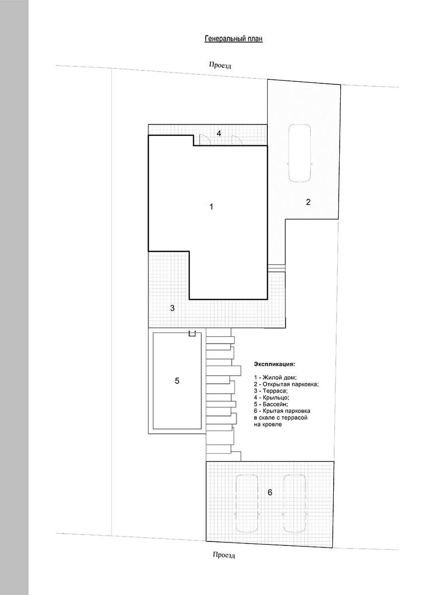 Частный дом расположен на склоне с великолепным видом на Геленджикскую бухту. Участок небольшой, имеет вытянутую форму, с двух узких торцов ограничен проездами, перепад между которыми составляет около 5 метров. Архитектурная концепция развивалась исходя из видовых характеристик участка, с основной ориентацией на море с одной стороны, и горы — с другой. Около входной группы предусмотрено одно парковочное место под навесом кровли второго этажа. Крытая парковка на две машины размещена на другом торце участка, расположенного ниже по рельефу. Это позволило вписать места автомобилей в выемку скалы и организовать на ее крыше дополнительную террасу. Так же из-за перепада участка торец бассейна получился открытым, выполнен в стекле, что дополнительно открывает вид на море.