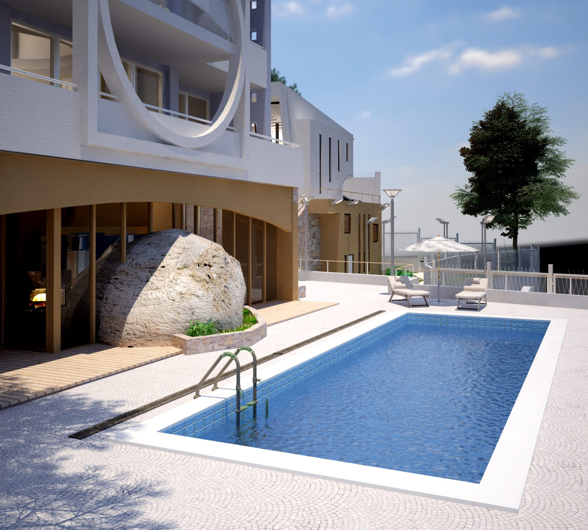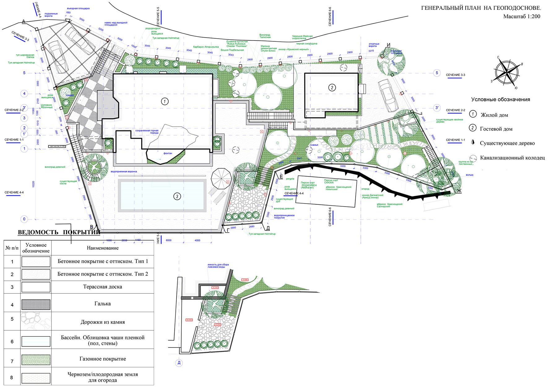 При проектировании главной трудностью было террасировать участок на пять уровней и разместить на них дом, бассейн размерами 14 Х 4,5 м с зоной отдыха, стоянку на 3–4 автомобиля, сад, гроты и игровые зоны.