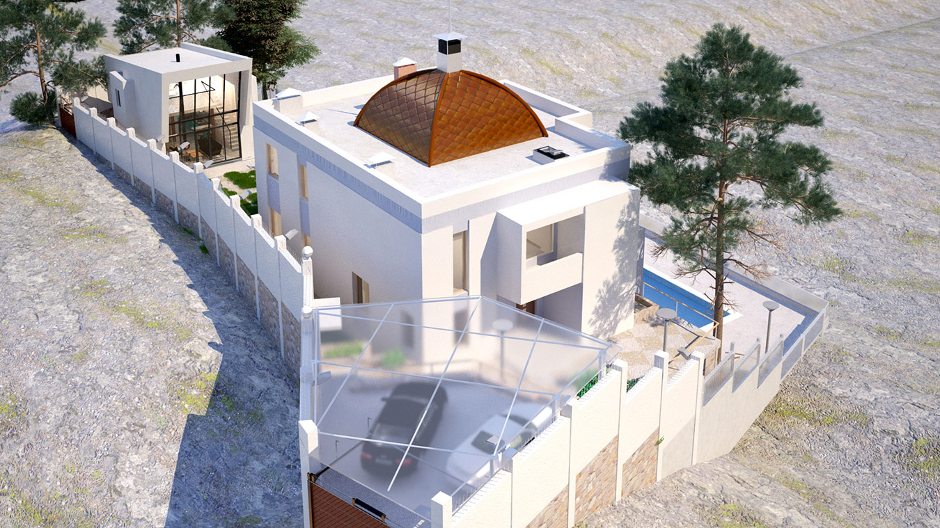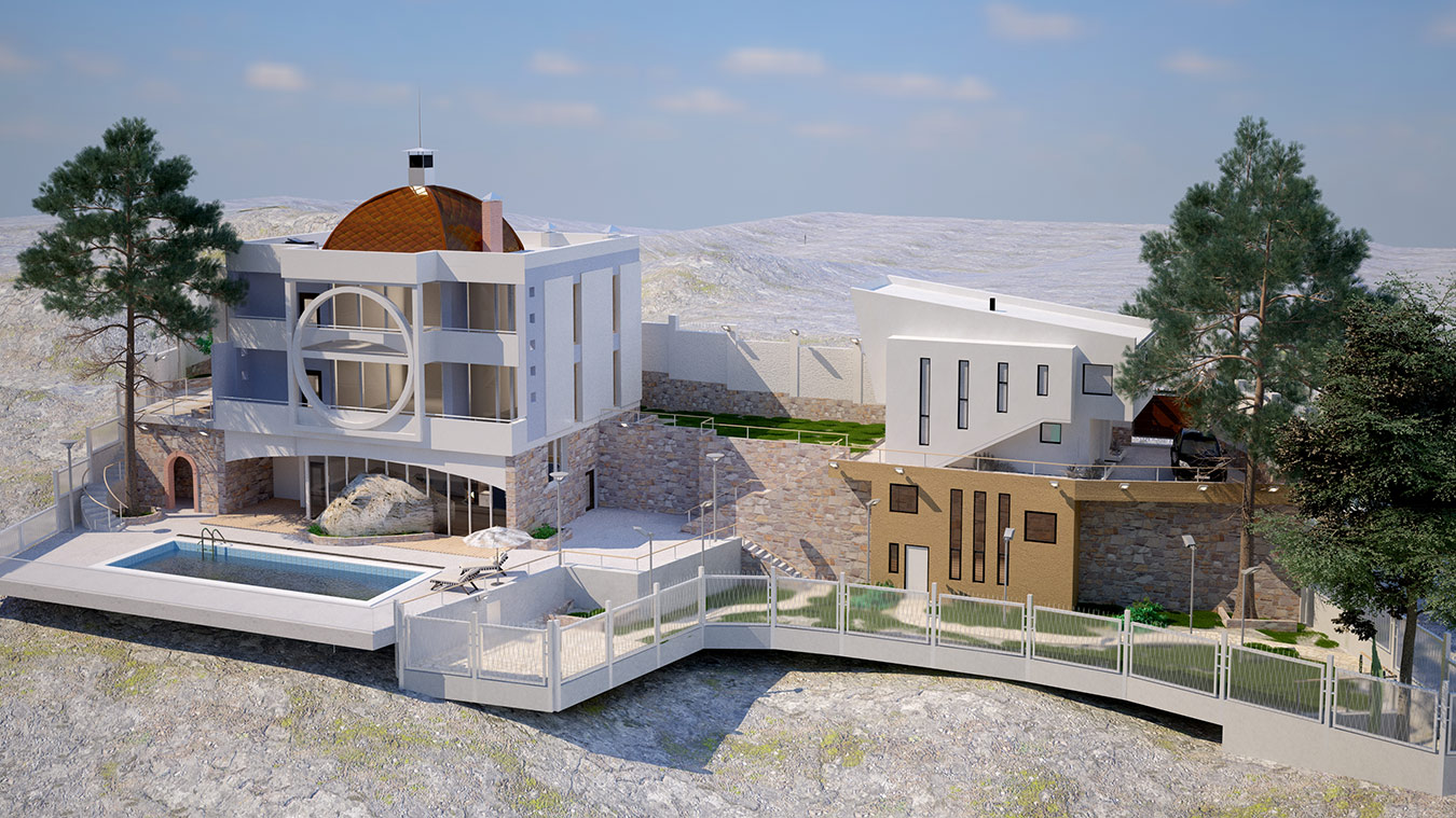 Дом запроектирован двухэтажным, плюс цокольный этаж, заглубленный в грунт с трех сторон и открытый в сторону моря.