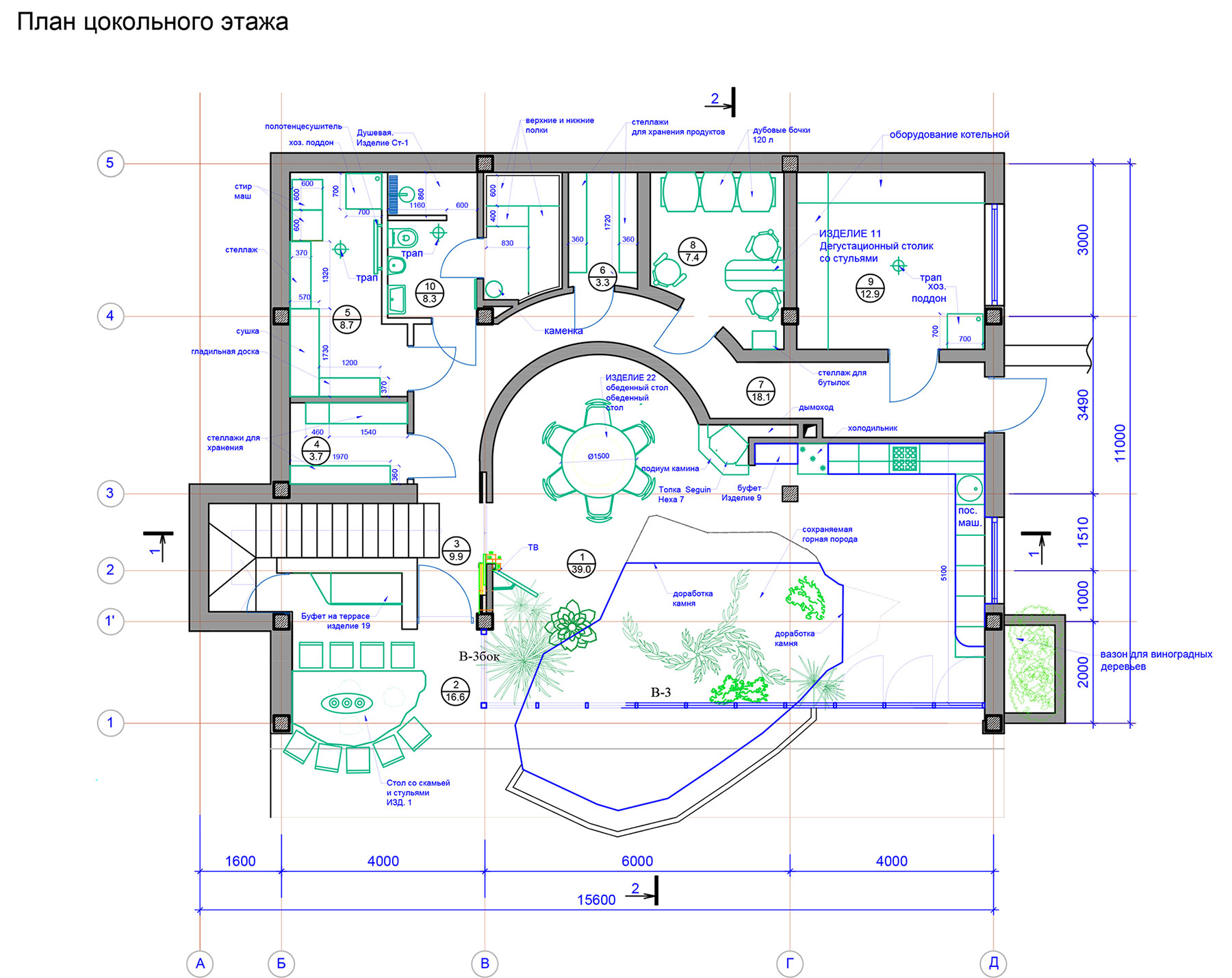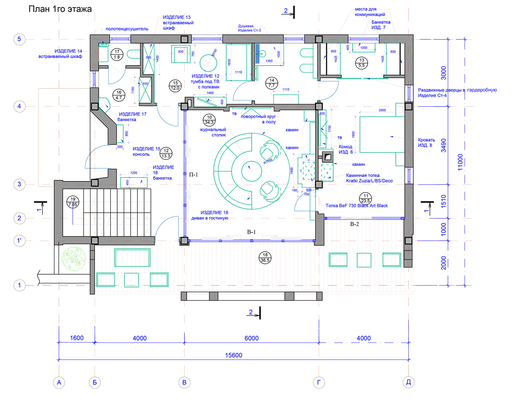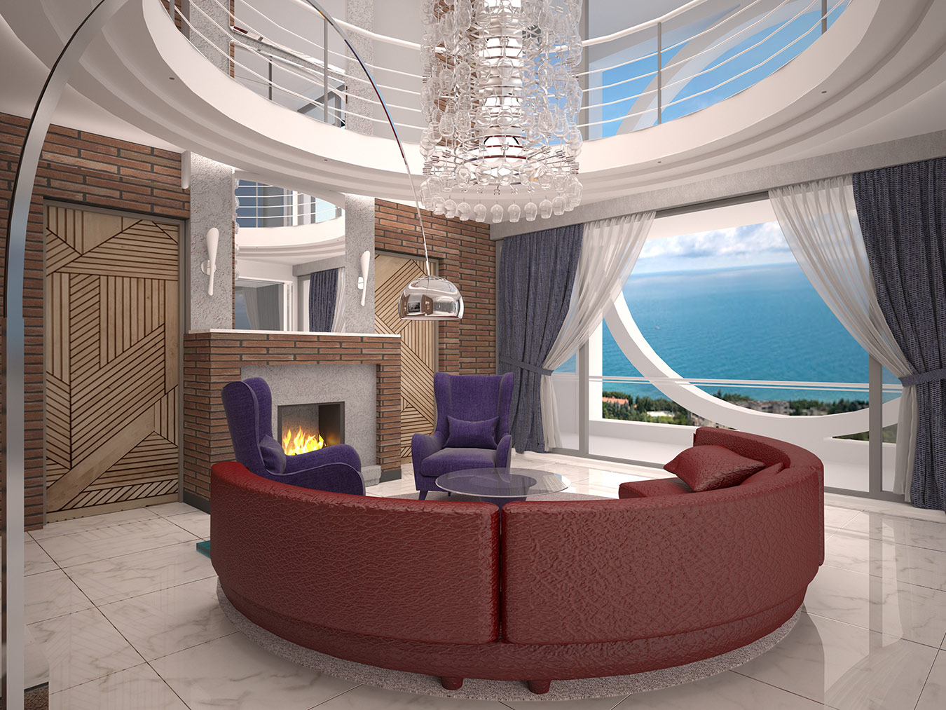 Гостиная является главным помещением дома, пронизывающим по вертикали все пространство первого и второго этажа и завершающимся куполом. Эта вертикальная ось фиксируется шестиметровой люстрой и вращающимся подиумом в полу гостиной, позволяющим поворачивать диванную группу на 360◦ и формировать четыре функциональные зоны: отдыха с видом на террасу и море, каминную, просмотровую ТВ и фуршетное пространство.
