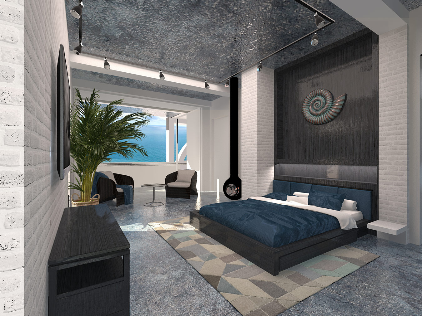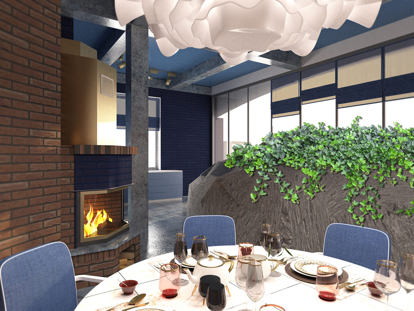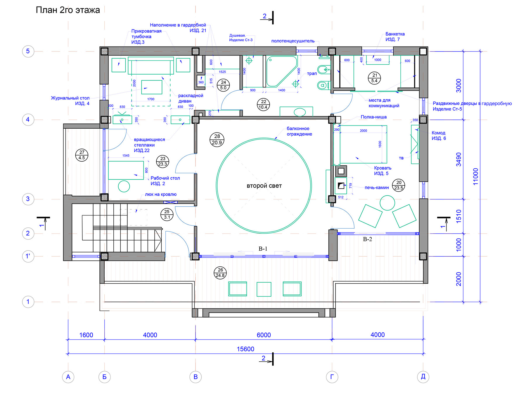 Гостиная является главным помещением дома, пронизывающим по вертикали все пространство первого и второго этажа и завершающимся куполом. Эта вертикальная ось фиксируется шестиметровой люстрой и вращающимся подиумом в полу гостиной, позволяющим поворачивать диванную группу на 360◦ и формировать четыре функциональные зоны: отдыха с видом на террасу и море, каминную, просмотровую ТВ и фуршетное пространство.