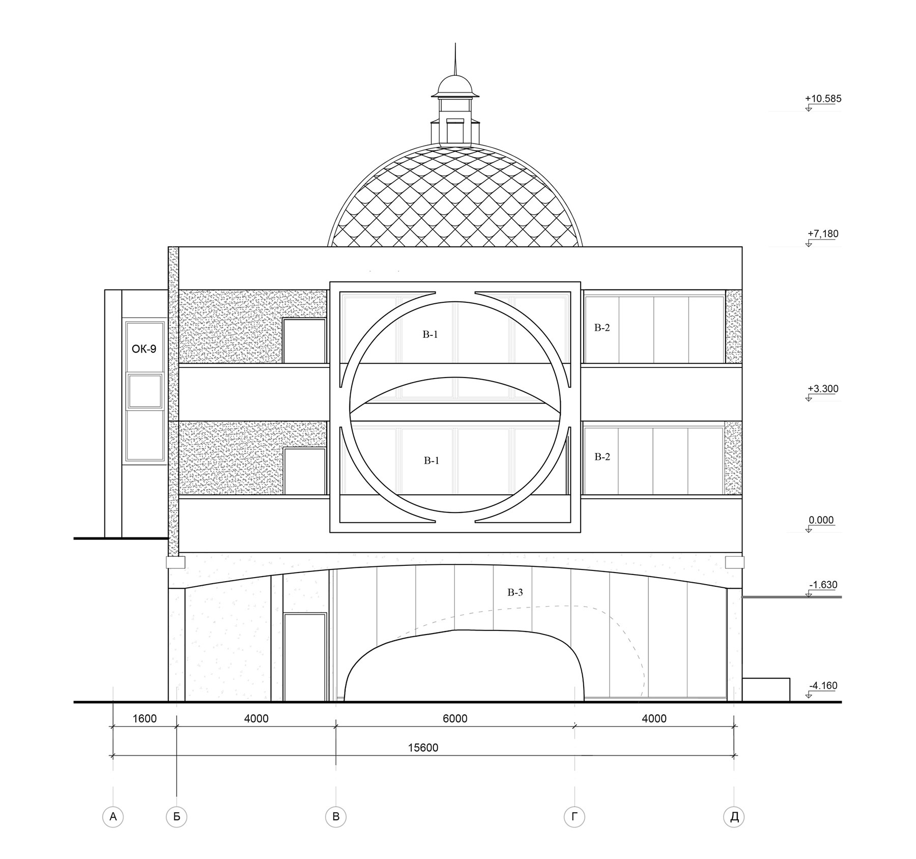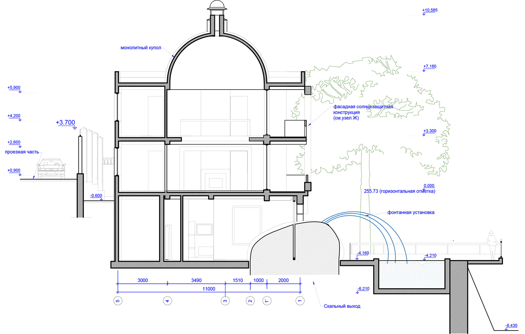 Купол в верхней точке оснащен мощным автоматическим вентилятором, обеспечивающим постоянное движение воздуха снизу вверх через трехсветный объем гостиной.