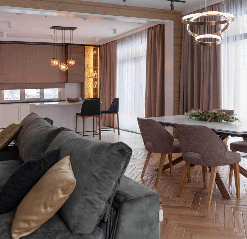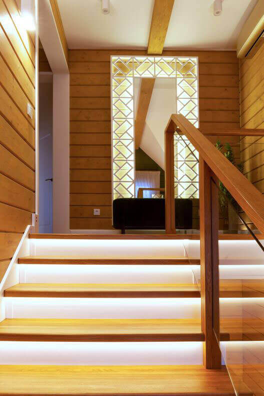 Дом расположен на севере области. Нашим стремлением было создать уютную и теплую атмосферу. В первую очередь мы сделали ставку на цветовую палитру материалов и обилие света как дневного из окон, так и на различные световые сценарии с применением теплого спектра свечения.