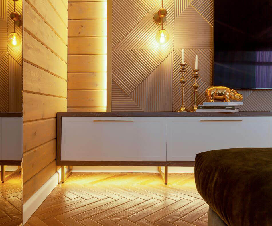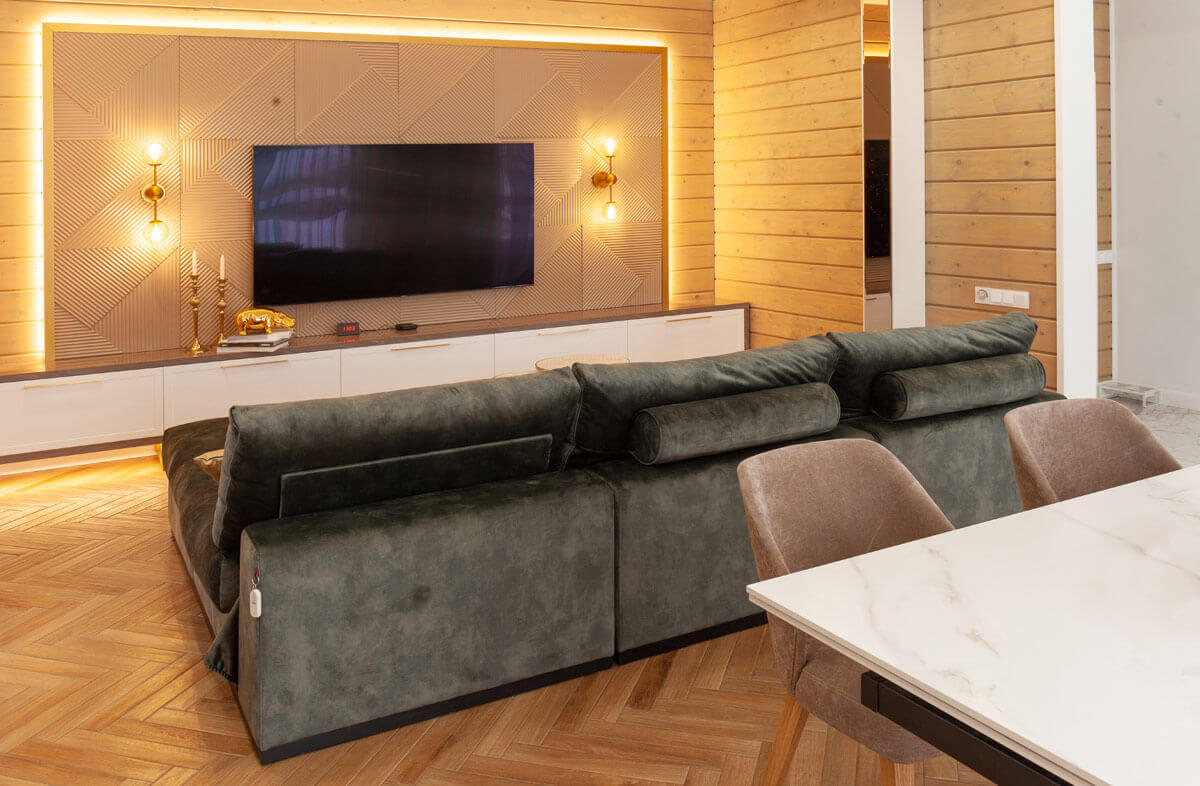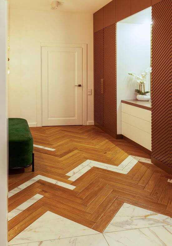Единой линией проходит цвет дуба золотистого, каррарского мрамора и сливочно-кофейная гамма. На фоне всей палитры акцентом является цвет лесной зелени в виде дивана и элементов декора. Многие элементы повторяются с целью создания единой линии. Плитка на полу в виде шеврона (ёлочки) символично повторяет 3D-ферезеровку в панелях за ТВ и на шкафу в холле.