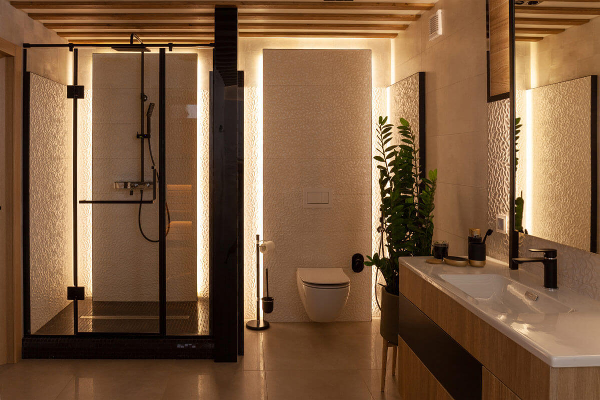 Дом выполнен из клееного бруса и имеет 2 этажа и цокольное помещение. Цокольный этаж целиком и полностью отдан под спа-индустрию. Комната отдыха с небольшой кухней, мягкая зона с тв, тренажерная комната и гардероб. Парилка со световой панелью из соляных блоков и срезов эвкалиптового дерева. Ванная и две душевых, уборная и раковина. Из цокольного этажа имеется отдельный выход в сад. Главные акценты — объемное панно с рыбками и применение плитки, как мелкая рябь по воде. Боковые диодные ленты подсвечивают весь рельеф и создают особую атмосферу. Первый этаж гостевой. Здесь у нас кухня-гостиная, холл и санузел.