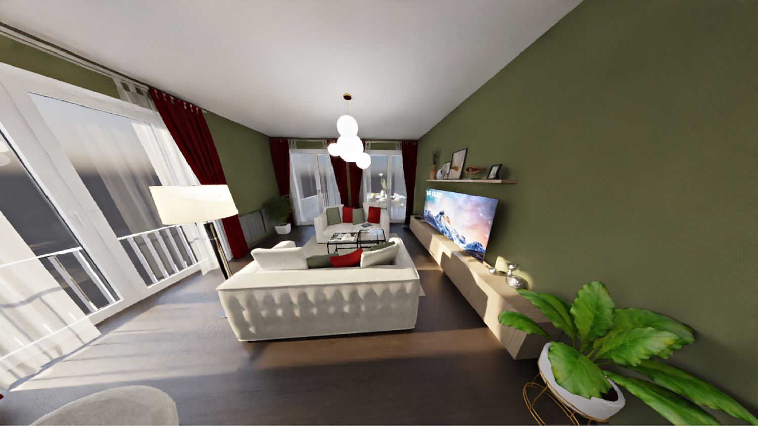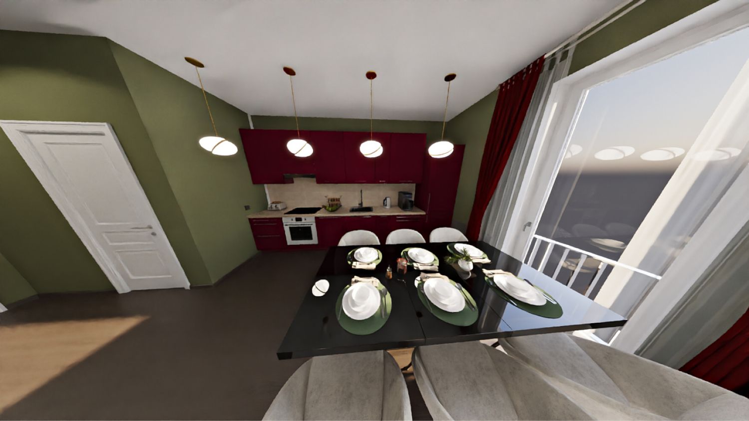 Интерьер квартиры «Свежесть утра» — светлое, функциональное пространство для повседневной жизни и отдыха. Концепт опирается на свежую палитру: мягкие зелёные стены создают фон, белая мебель даёт ощущение воздуха, бордовые шторы и кухонные фасады добавляют энергию и ритм.
