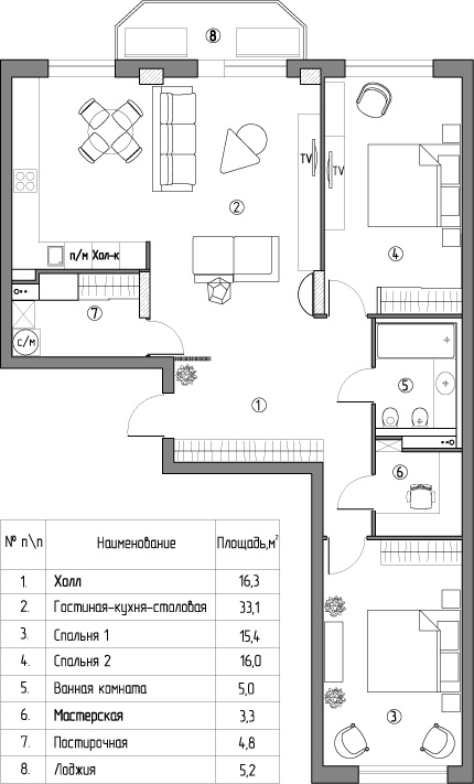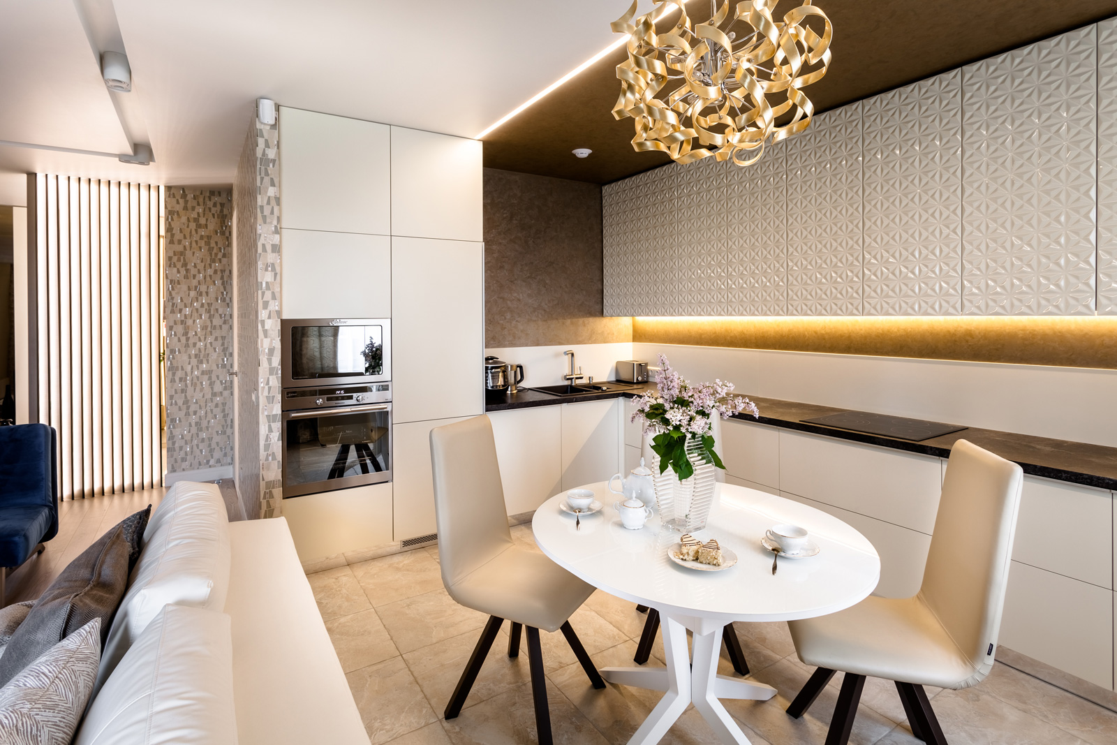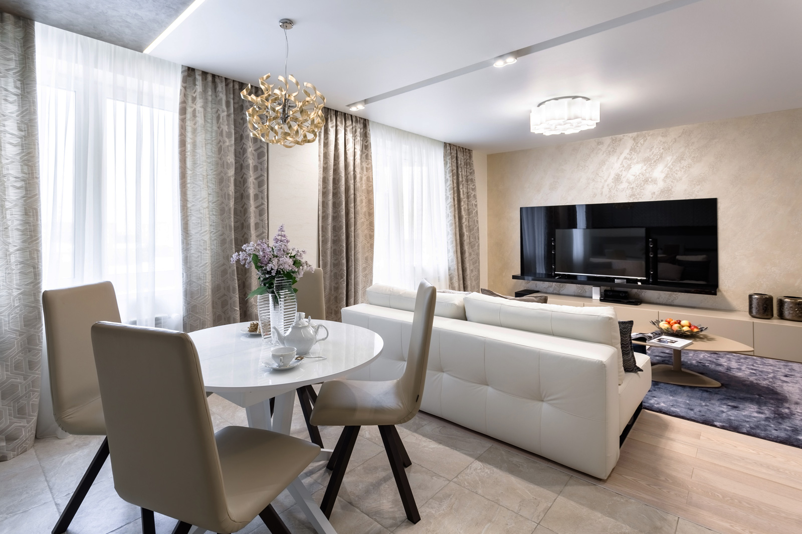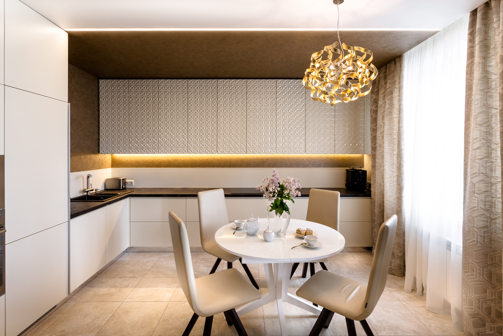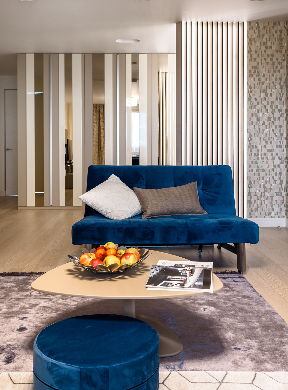 В условиях небольшой площади помещений в данной квартире основной задачей, поставленной заказчиком, было максимальное расширение пространства. В результате перепланировки объединены три объема: гостиная, кухня и холл.