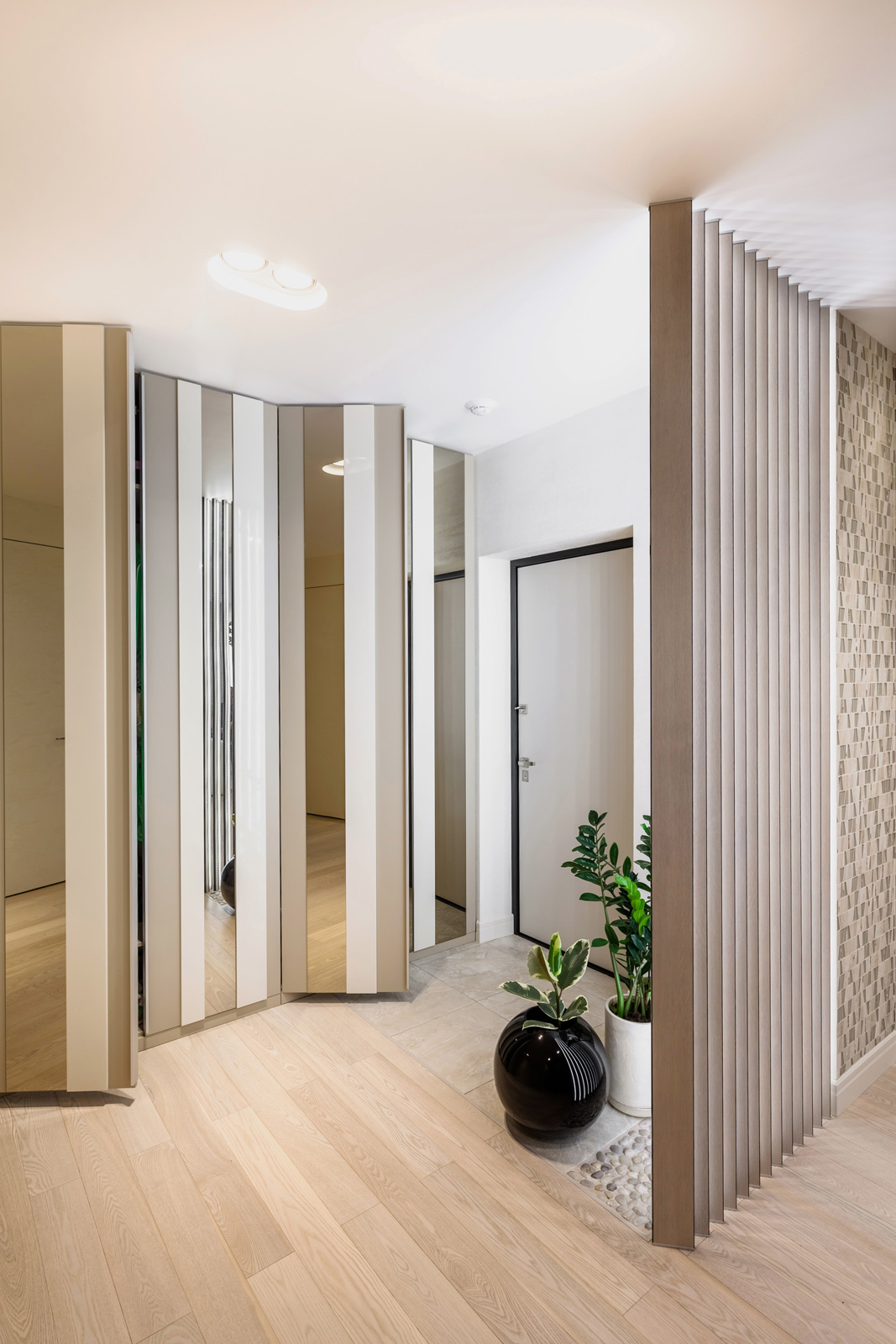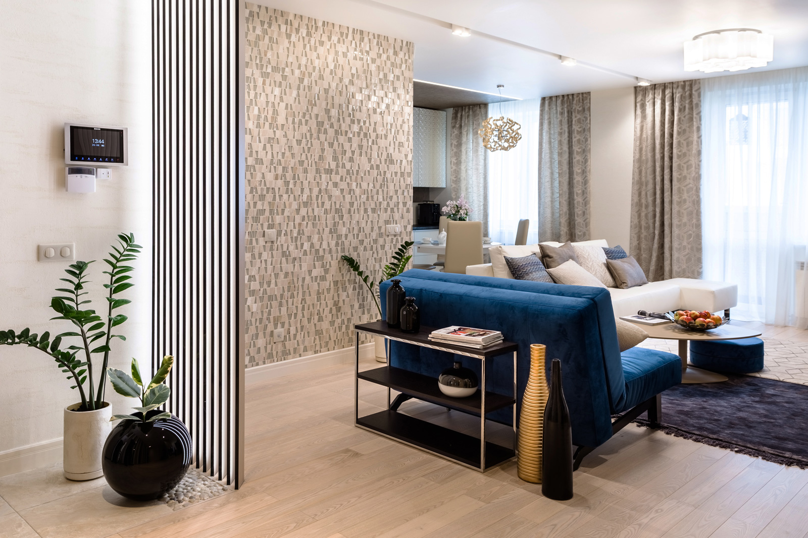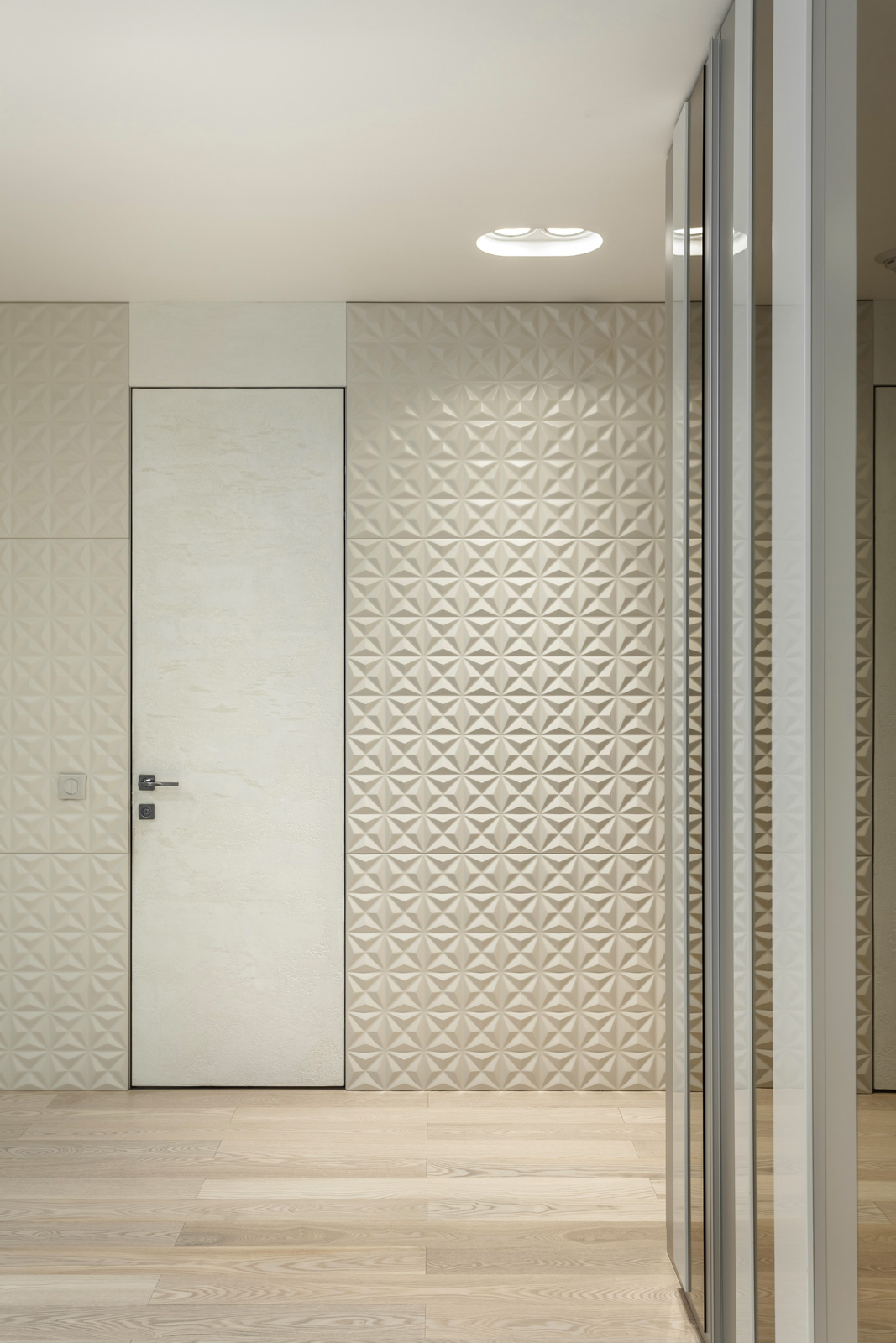 Легкая декоративная перегородка, ставшая вертикальным световым элементом интерьера, условно разделила входную зону и основное пространство.