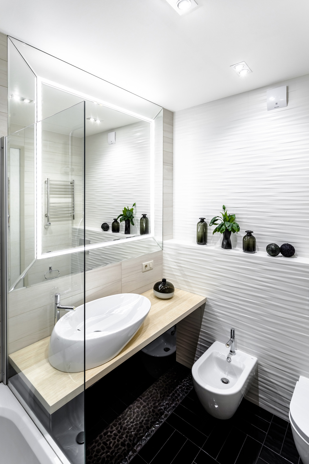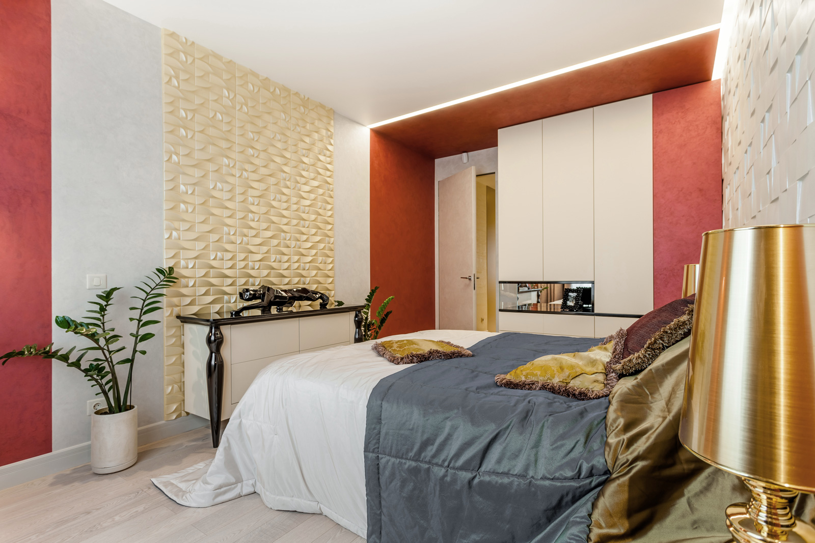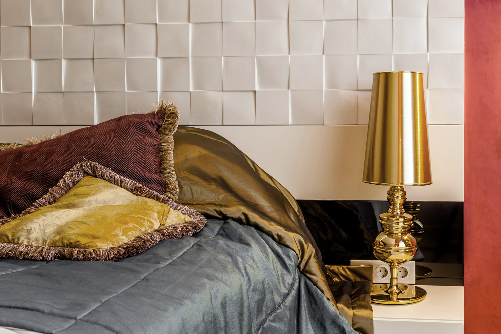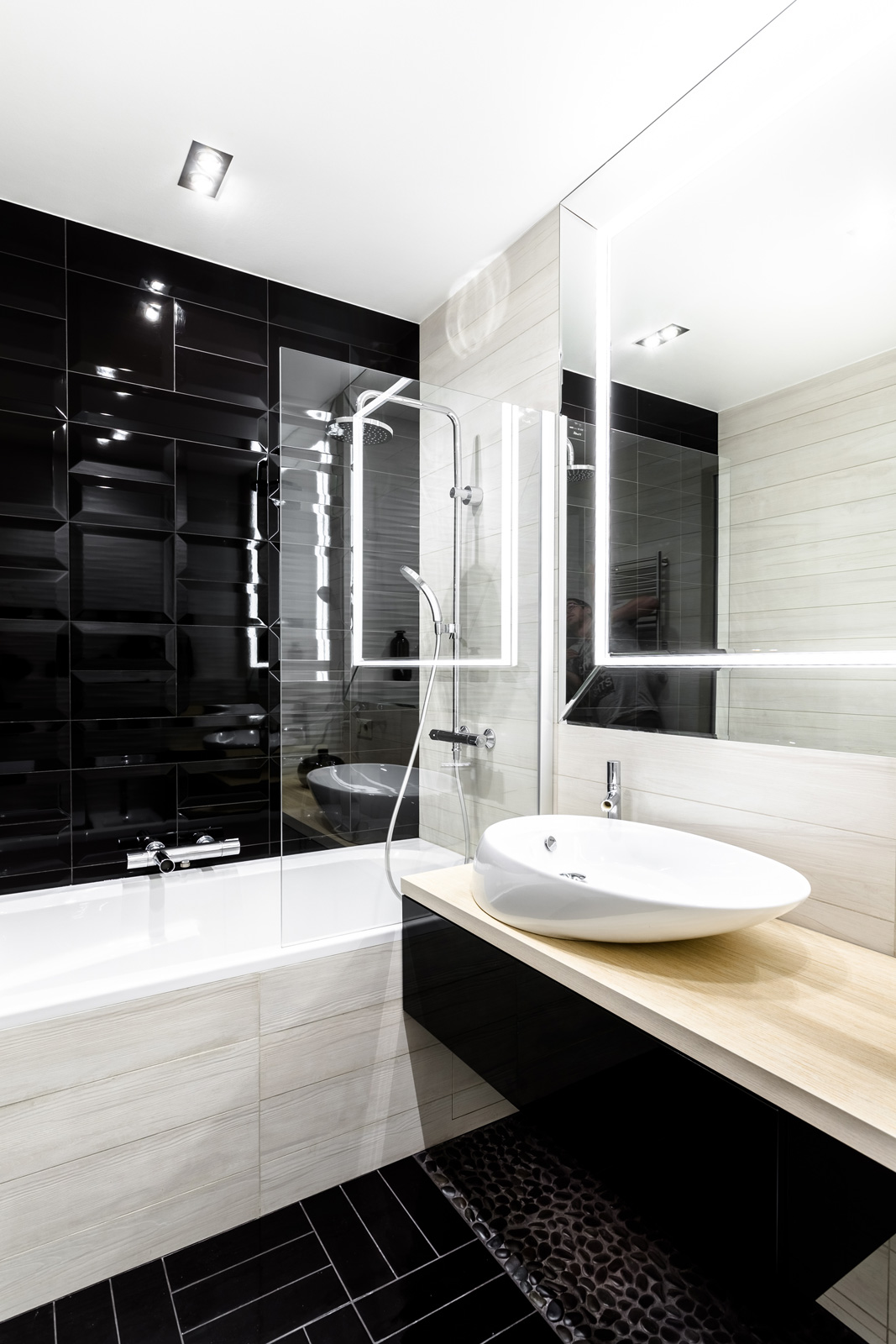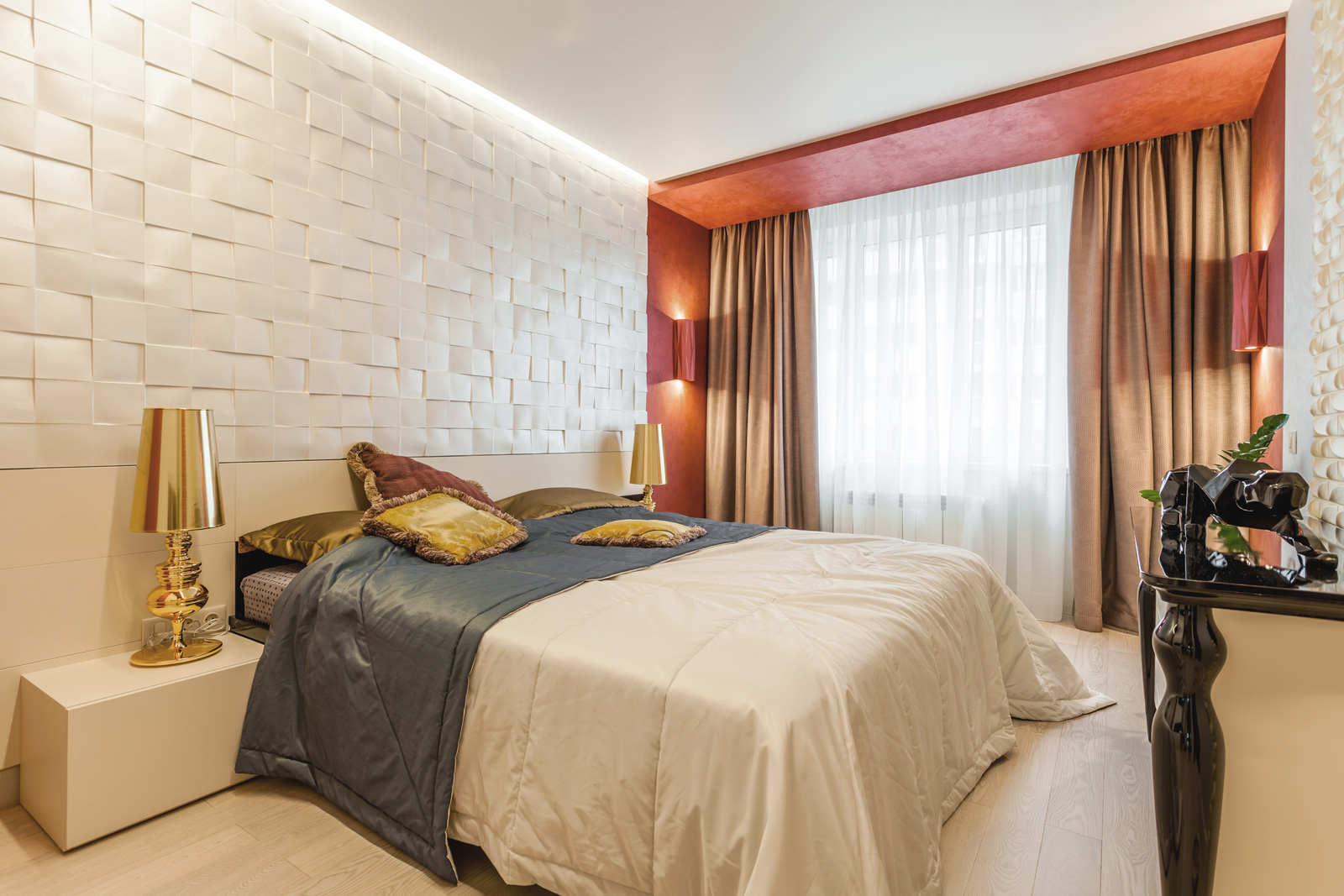 Весь интерьер квартиры выполнен в современном стиле. Он выдержан в светлых тонах с дополнением ярких контрастных цветовых акцентов, которые привнесли в его дизайн цветовую живость и графичность. В оформлении использованы материалы разных фактур.