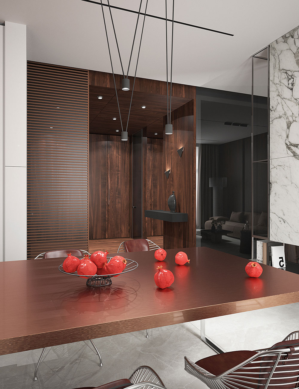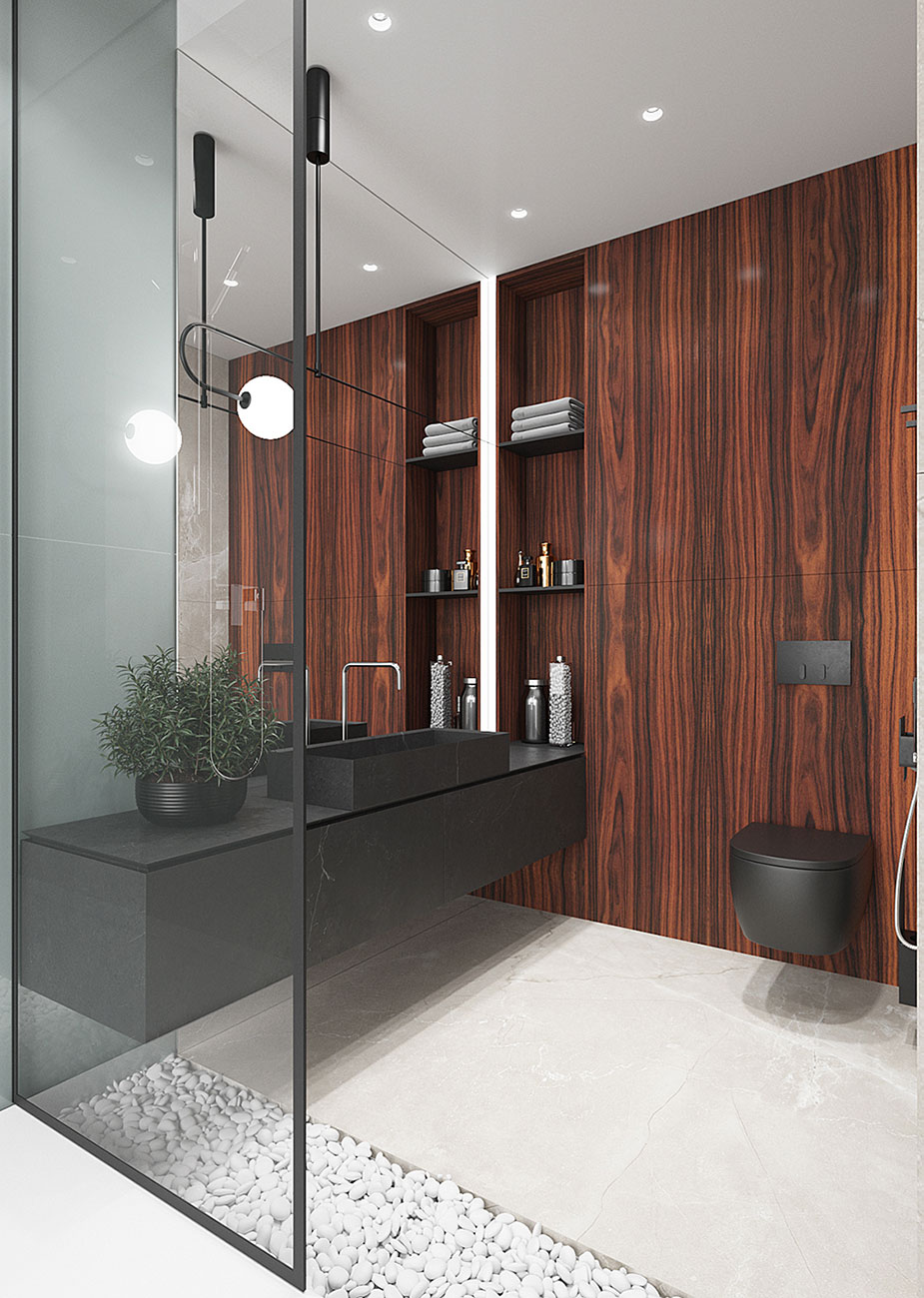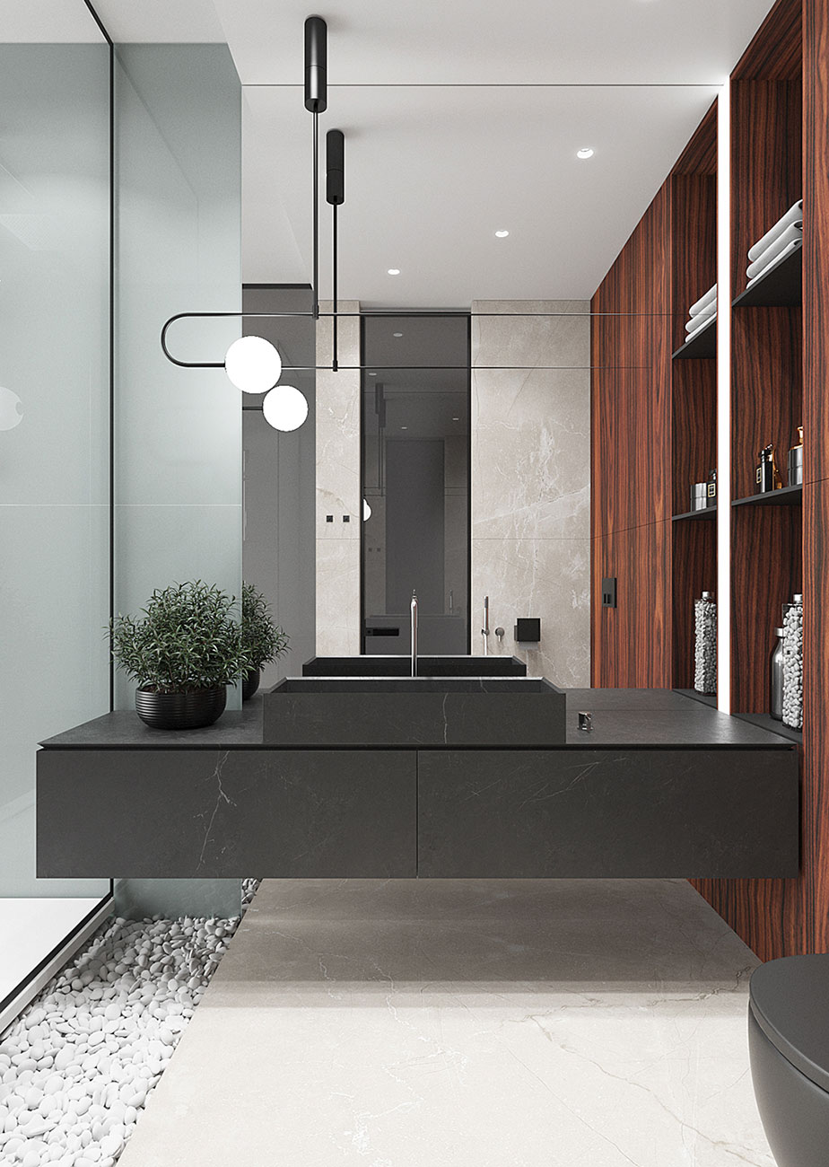 В отделке всех помещений использованы крупноформатные материалы: керамогранит, натуральный камень, шпонированные МДФ-панели, стекло. Выбрав большие размеры, мы работаем «широкими мазками», которые позволяют создать цельность и монументальный характер интерьера.