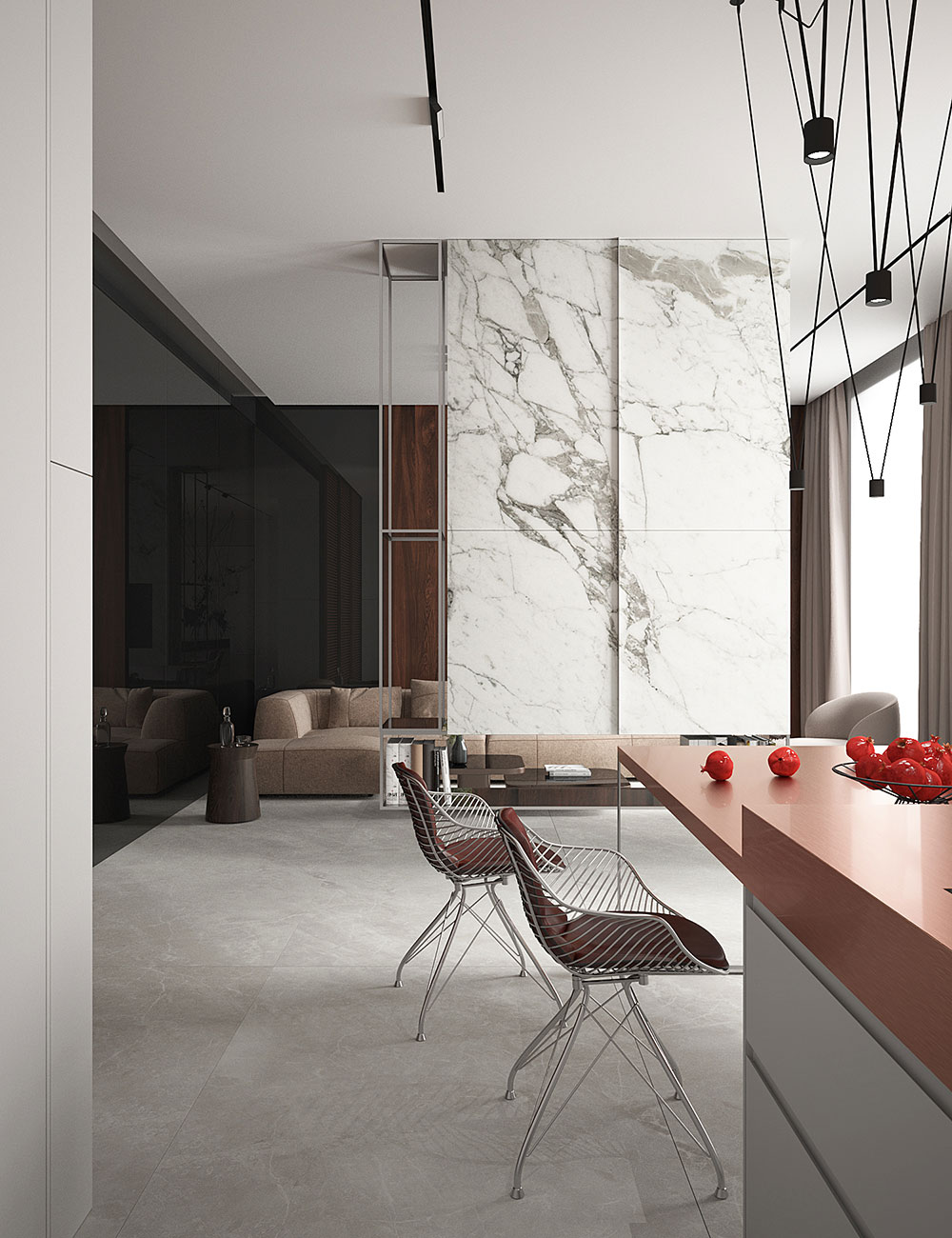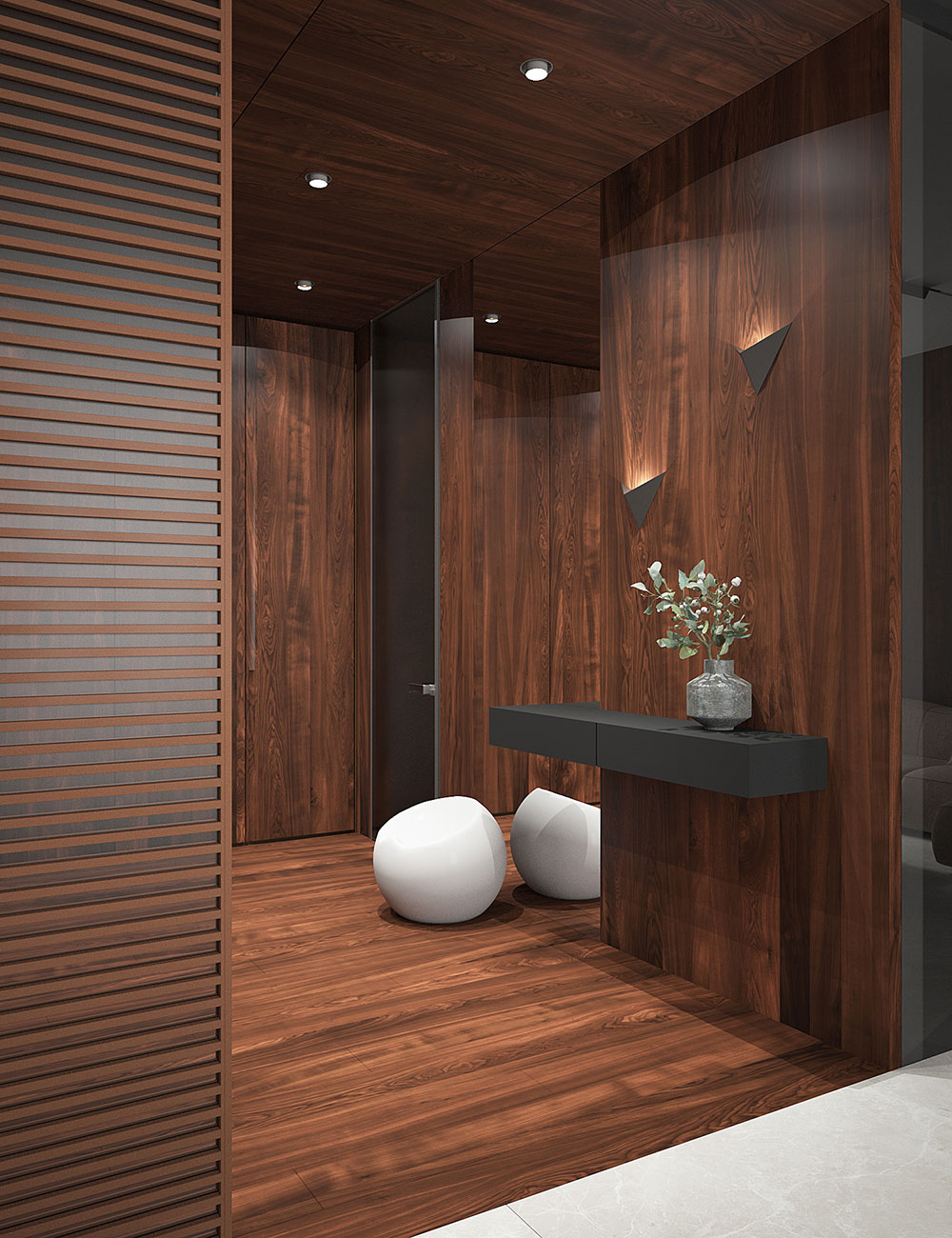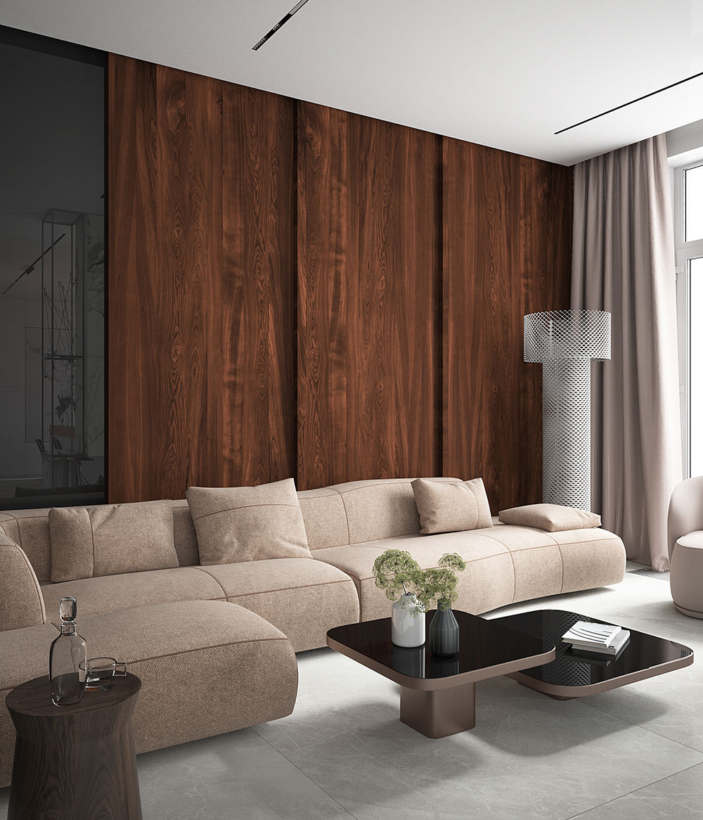 Параллельно с функцией мы закладываем и концептуальный смысл в проекты. В объеме прихожая представляет собой куб, полностью отделанный темным деревом, в который вы попадаете из замкнутого пространства лестничной клетки. Человек постепенно переходит из меньшего объема в больший. Дальше взору открывается пространство гостиной, залитой дневным светом сквозь ряд окон, ведущих на балкон. Попадая в гостиную, вы уже предвкушаете встречу с безграничным, а именно выход на балкон и ощущение воздуха и пространства. Таким образом, используя архитектурные приемы, мы выстроили плавный переход человека из одного состояния в другое.
