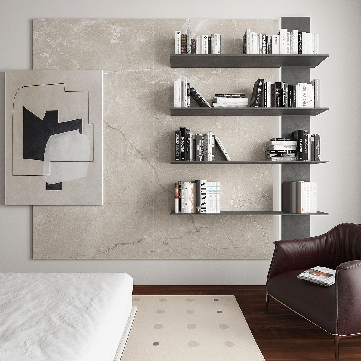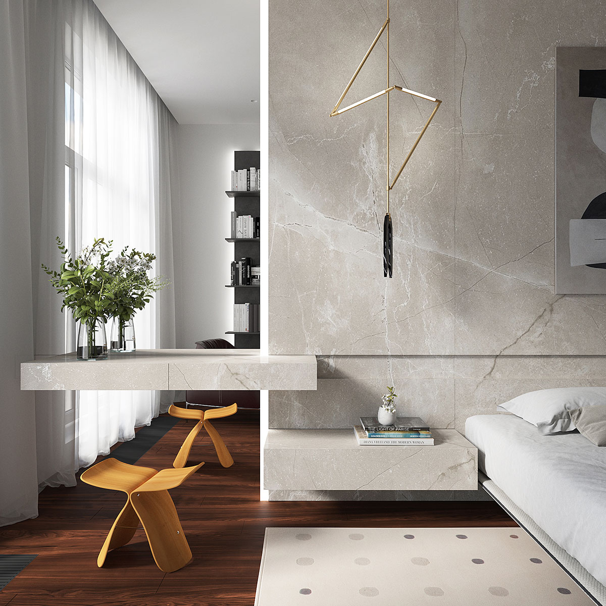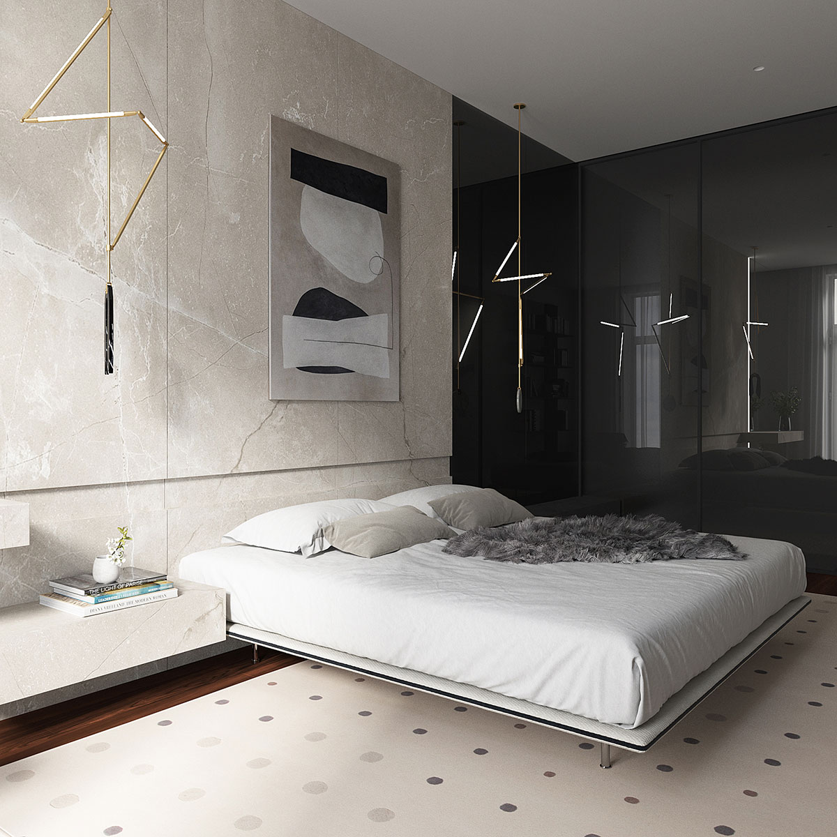 Неотъемлемой частью композиции спальни служат предметы искусства. Так, в изголовье кровати и на противоположной стене заняли свое место работы норвежского художника FinoPrydz, базирующегося в Нью-Йорке. Комфортный туалетный стол, а также кресло и полки для книг, входили в список пожеланий хозяйки.
