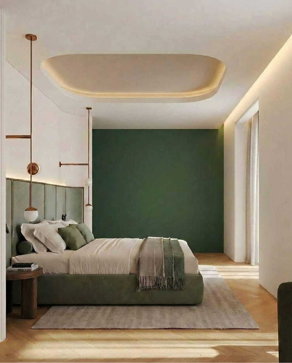 В спальне особое внимание уделено покою и звукоизоляции. Мягкое изголовье-панель в зелёной обивке тянется до самого потолка, гася лишние шумы и создавая ощущение защищённой ниши. Подвесные бра на медных штангах освобождают поверхность тумб, а контурная подсветка выравнивает общий свет, исключая резкие тени. Благодаря минималистичной палитре и свободным стенам здесь царит атмосфера уединённости и покоя.