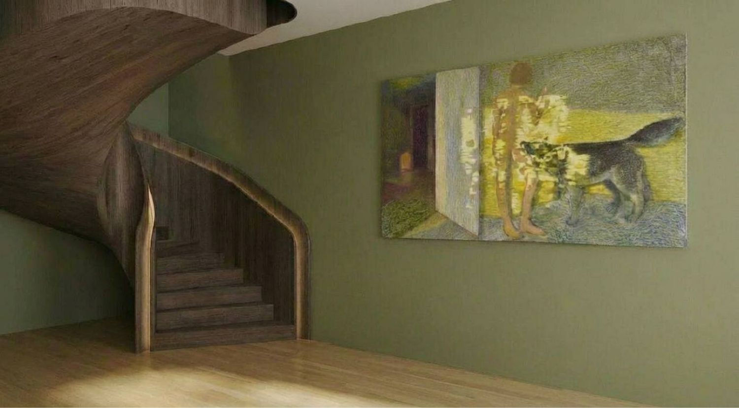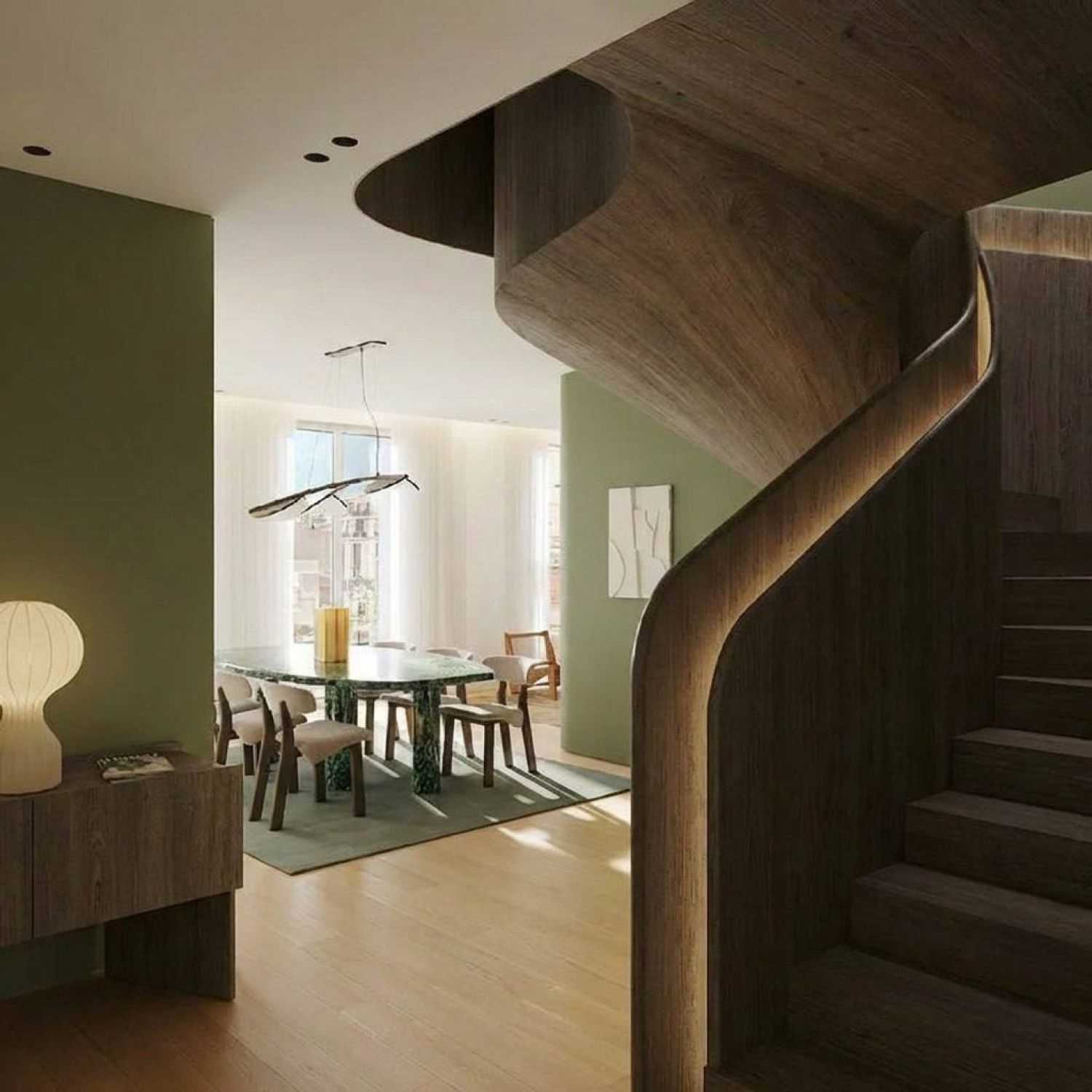 Столовая зона развивает тему плавных форм. Овальный стол из зелёного камня поддерживает главную палитру, а вокруг него собраны лаконичные деревянные стулья. Подвес с тёплым светом подчёркивает центр этой зоны. Рядом расположена скульптурная лестница из тёмного дерева со сглаженным поручнем — она связывает уровни и повторяет мотив текучих линий, пронизывающий весь проект.