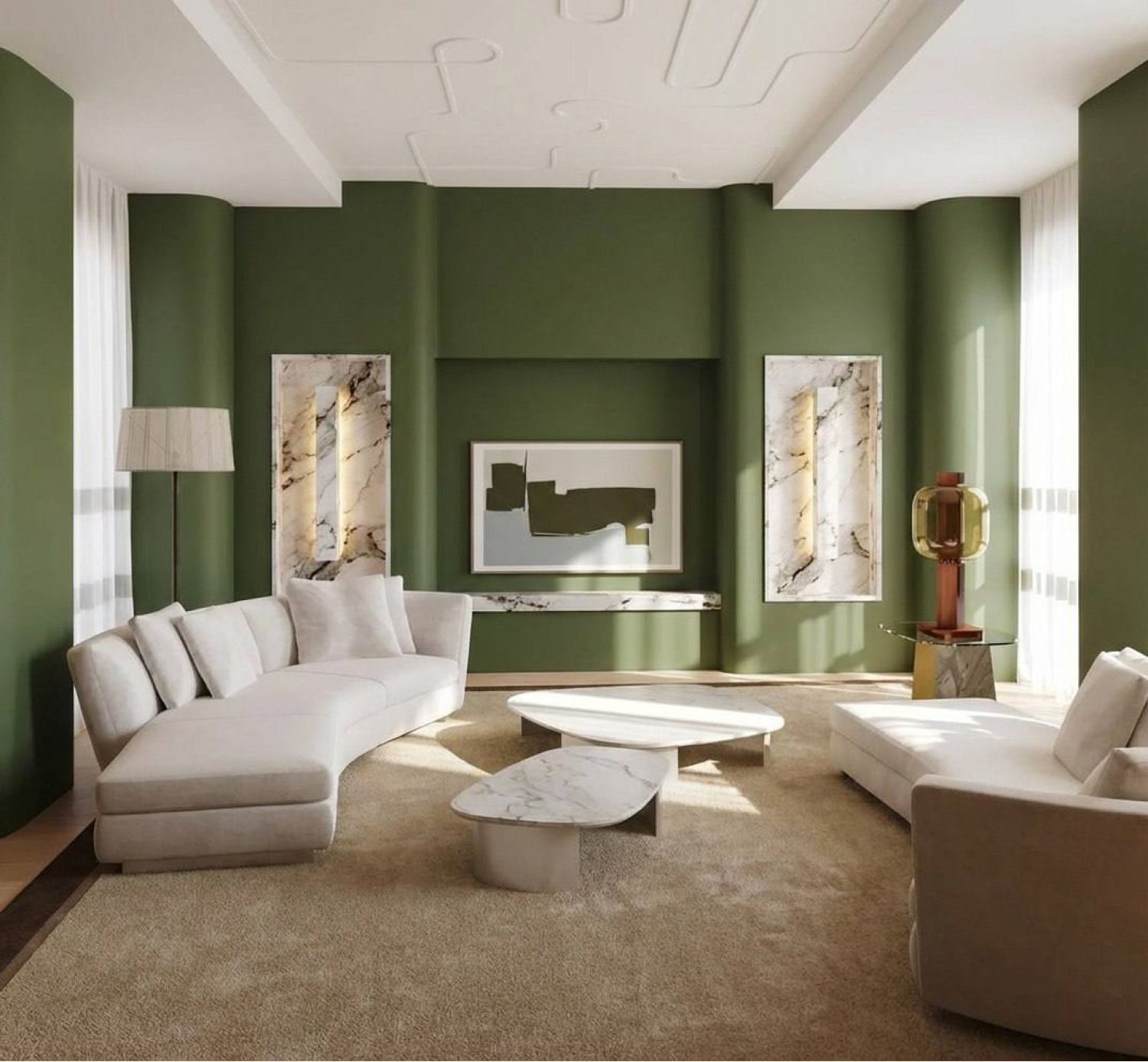 Интерьер квартиры Verdure задуман как спокойная, тактильная среда для жизни в городе. Базой здесь служит насыщенный зелёный цвет стен — он заземляет и собирает пространство, становится его визуальным якорем. Эту глубокую основу поддерживают тёплые породы дерева, песочные ковры, молочный текстиль и выразительные акценты из полированного камня и латуни, благодаря которым интерьер обретает благородную фактурную сложность.
