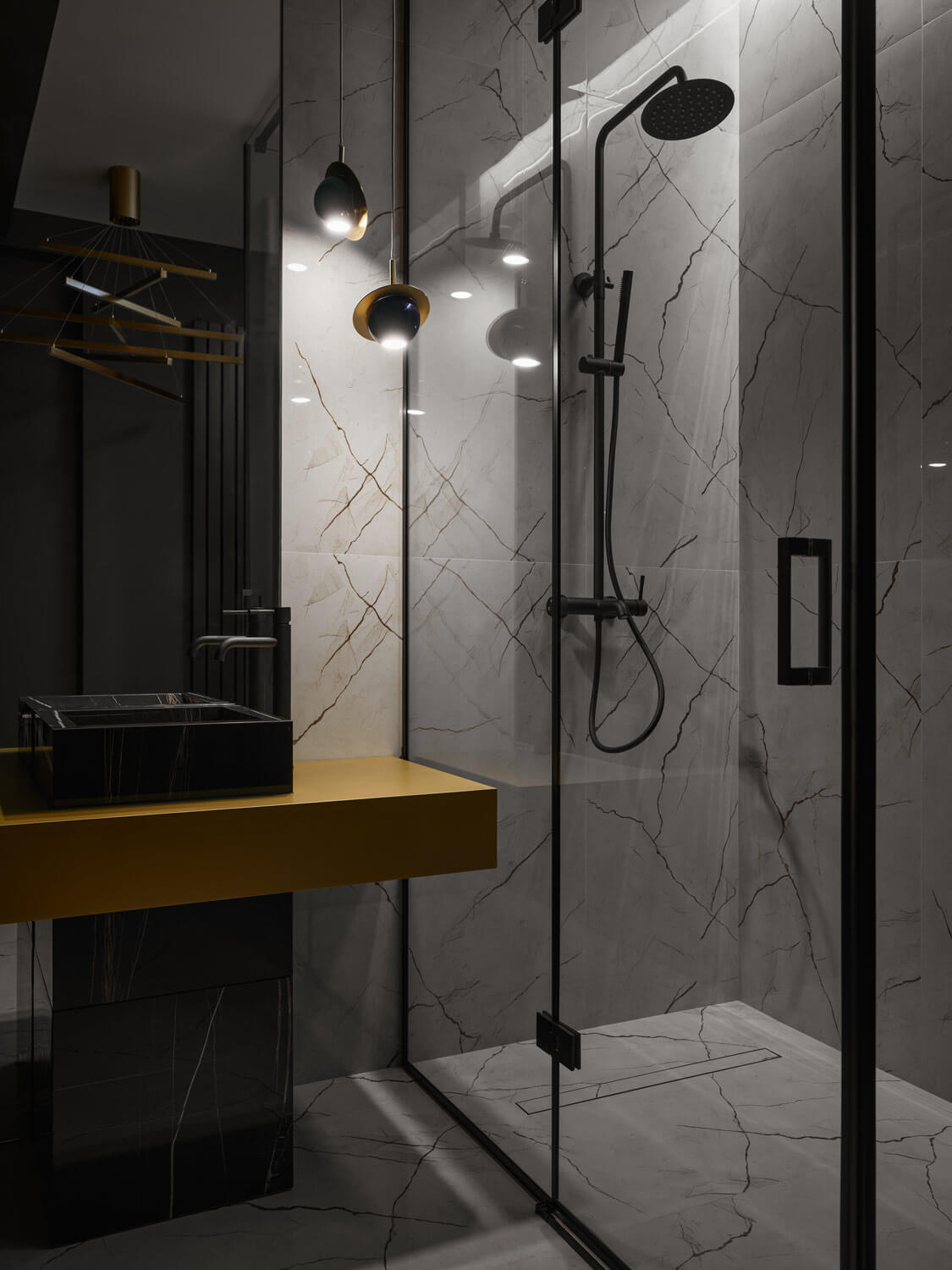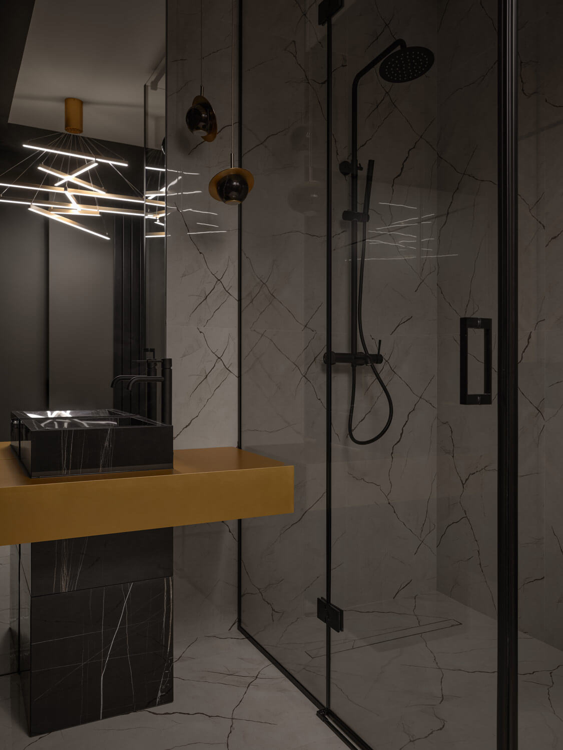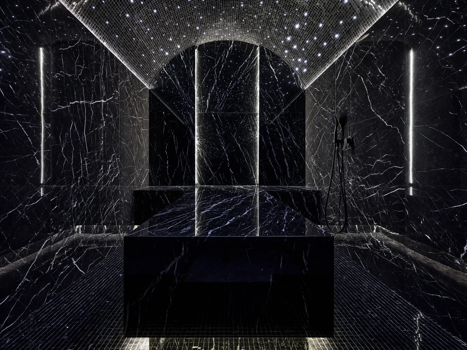 Хаммам со «звездным небом» целиком выполнен из черного мрамора. Большое количество темных оттенков, глянец камня придают помещению невероятную глубину.