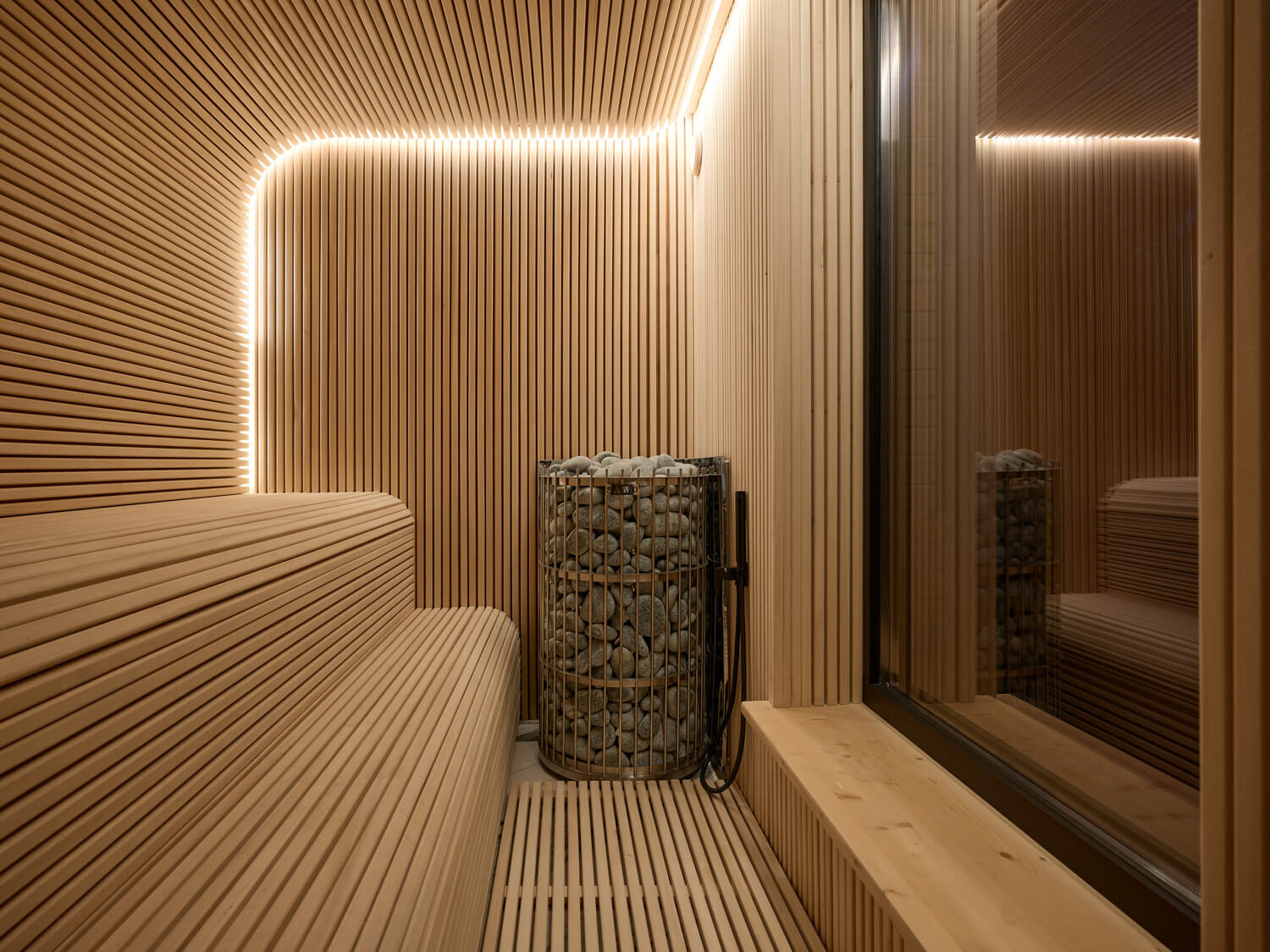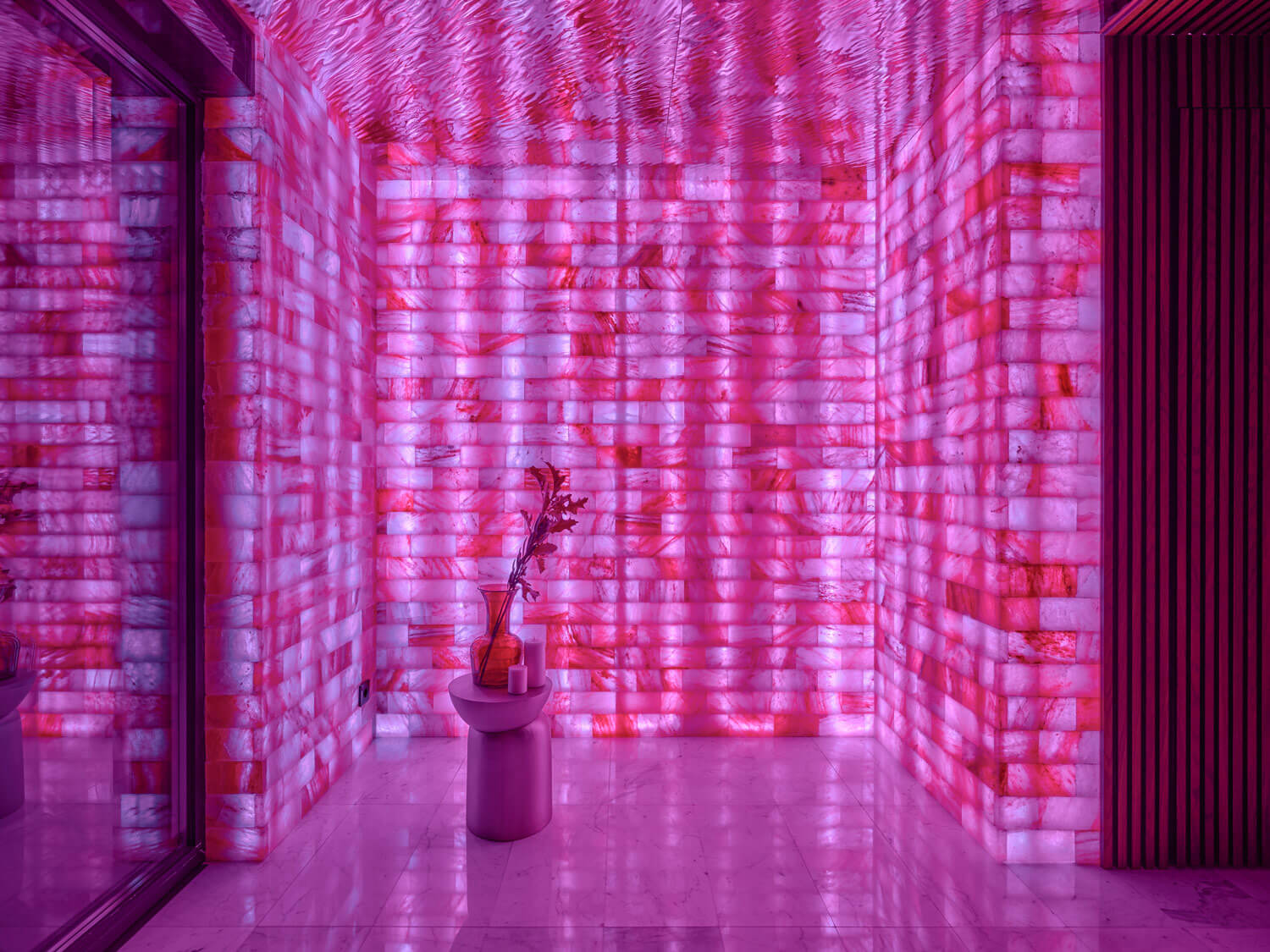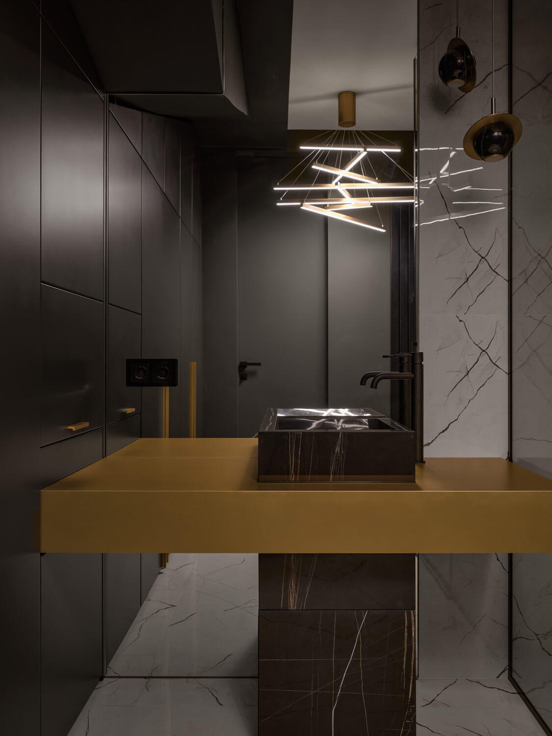 Хаммам со «звездным небом» целиком выполнен из черного мрамора. Большое количество темных оттенков, глянец камня придают помещению невероятную глубину.