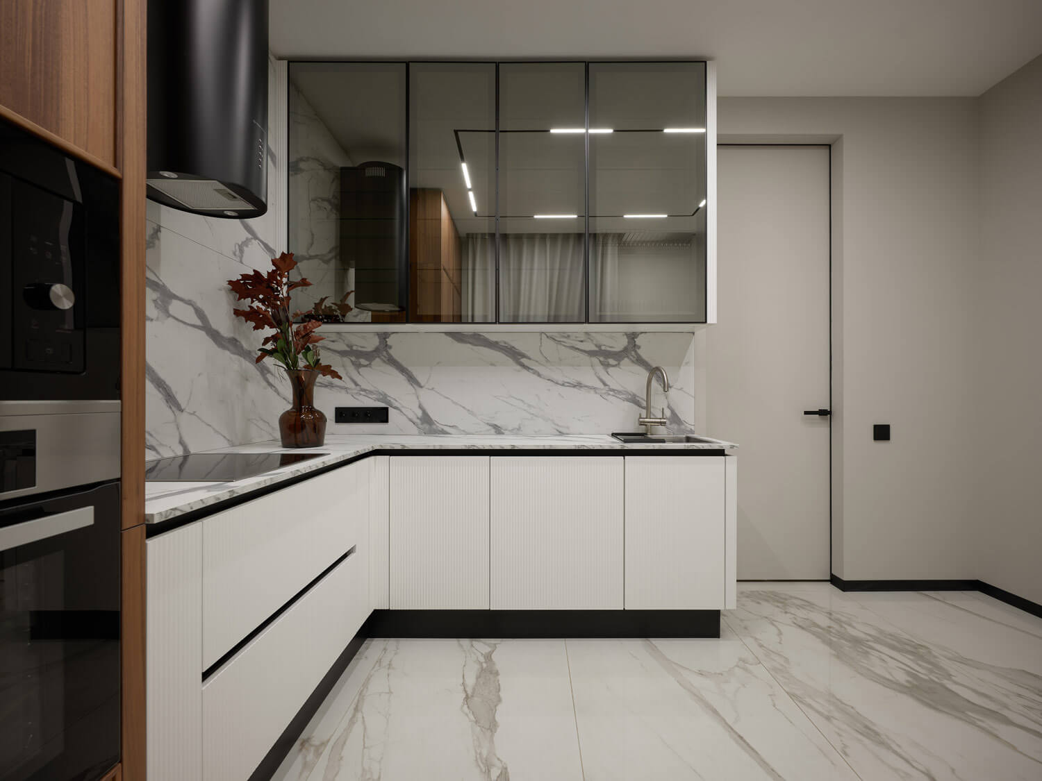 Конфигурация таунхауса была достаточно вытянутой, и автор проекта старалась сделать каждую зону максимально квадратной. Первый этаж — общее пространство. Здесь расположена зона приема гостей и оборудована так называемая техническая кухня: заказчики практически не готовят, и основная кухня была не нужна. Клиенты очень дорожат своим личным пространством, поэтому второй этаж занимают семейная гостиная и две детские комнаты. Третий уровень — приватная зона родителей с просторной спальней, кабинетом и большой гардеробной.
