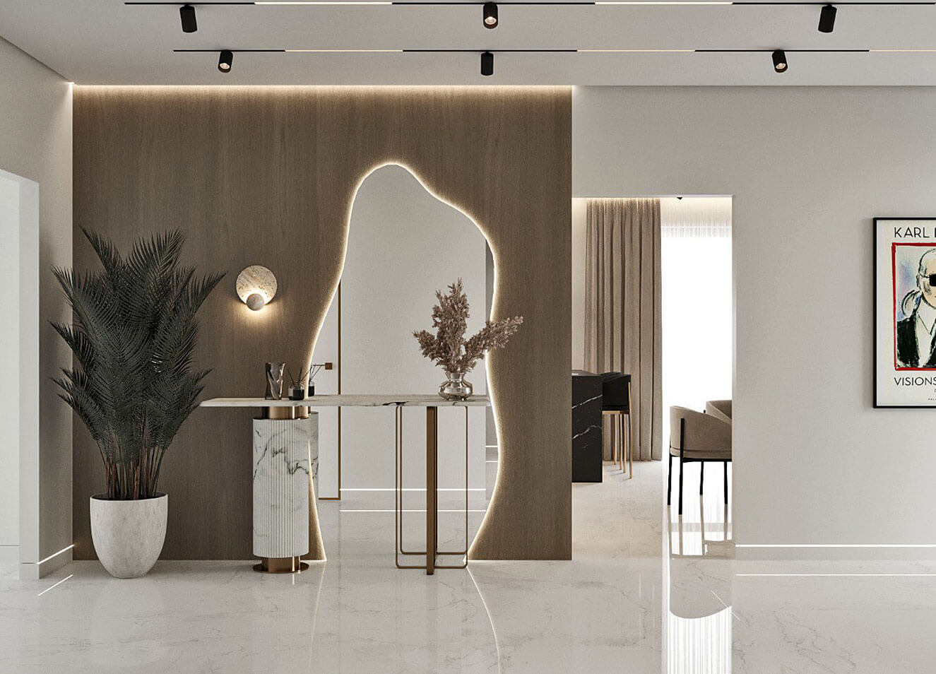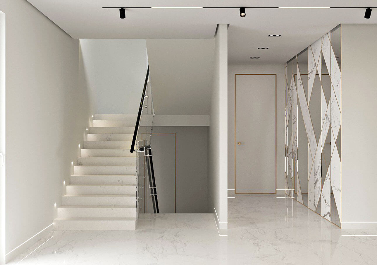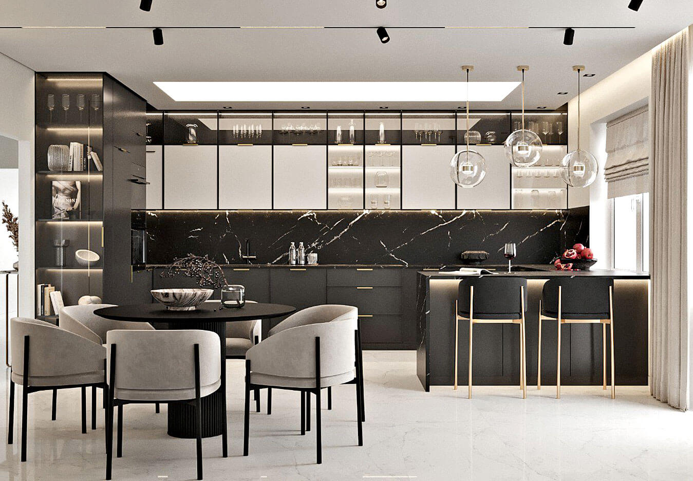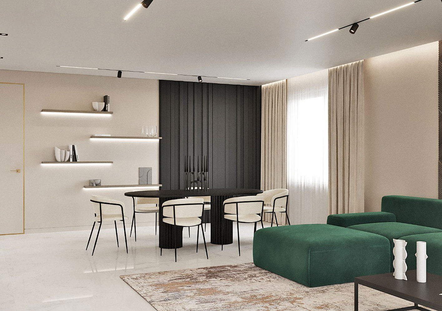 В данном проекте сочетаются брутальность заказчика с темными цветами и легкость заказчицы с элементами золота, что является частью характеристики каждого из хозяев дома.