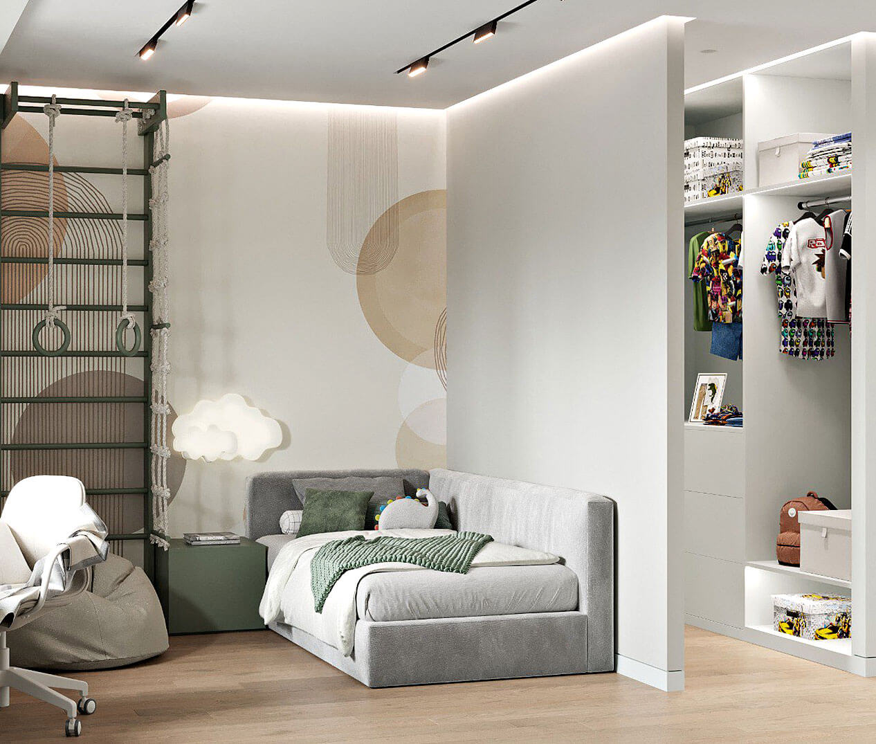 А светлая детская, с большим количеством цвета, в которой заложена функция спальни, рабочей и игровой зоны, создает хороший фон для развития и роста ребенка.
