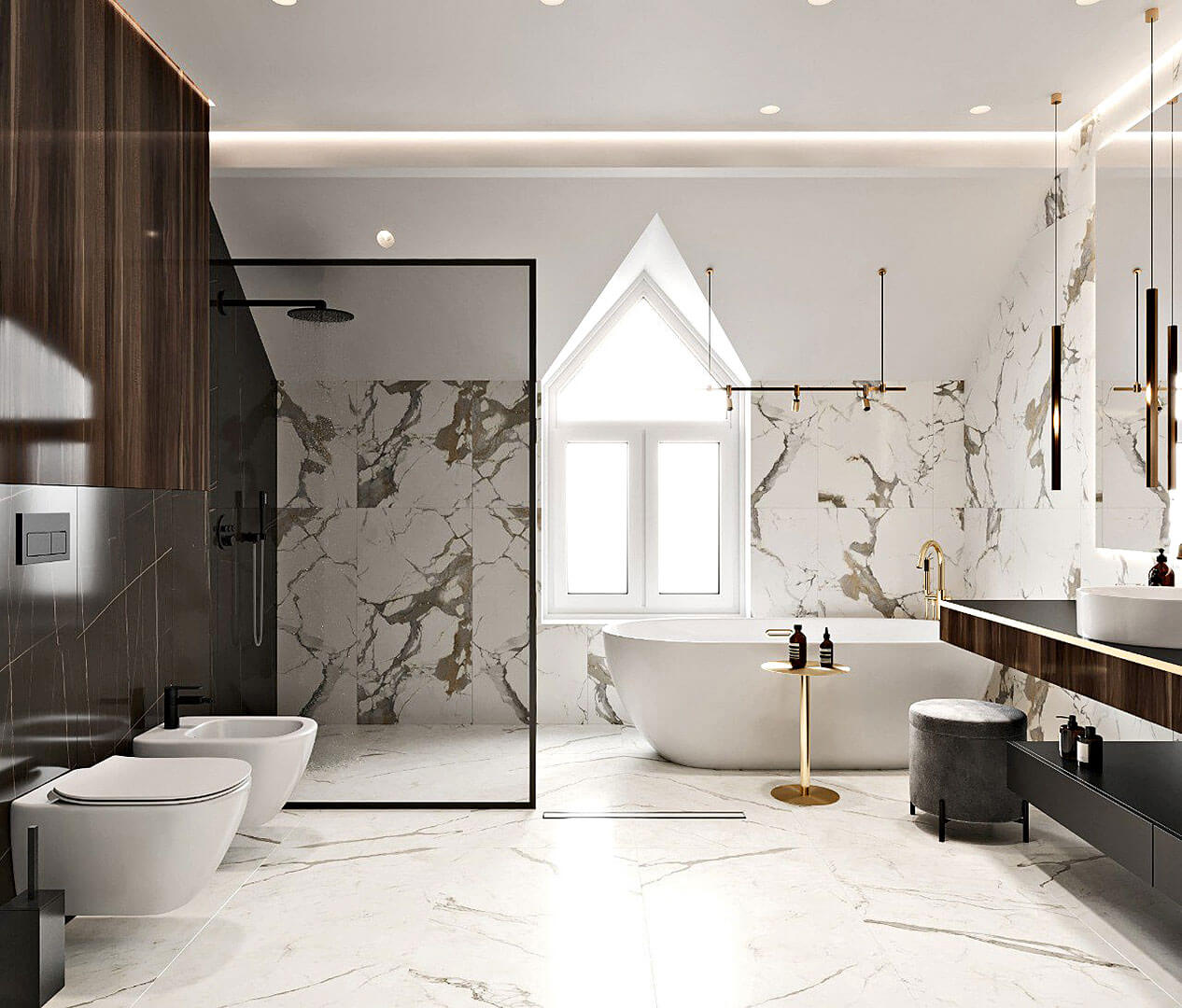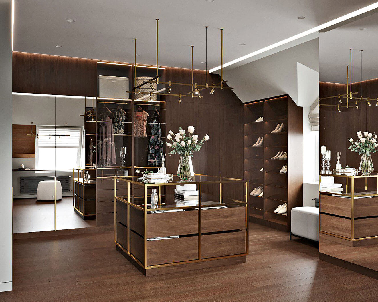 Это же прослеживается и во вспомогательных помещениях мастер зоны, таких как мастер санузел с контрастной плиткой, отдельностоящий ванной и черно-золотой сантехникой, и мастер гардеробная с большим обилием дерева.
