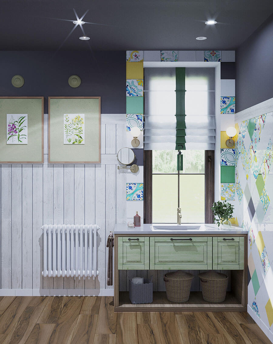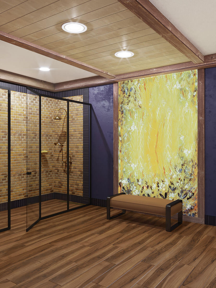 Травы и соцветия проявляются в отделочных материалах, будь то итальянская плитка ручной работы с цветочным орнаментом, трафарет полевого букета или обои с растительным принтом. Инжир вдохновляет своей сложной палитрой и структурой. Так, например, сочный сиреневый оттенок появляется в мокрой зоне, локально в санузле, прихожей. А вяленый медовый оттенок лежит в основе спортзала, помывочной, парной. Эклектичный интерьер с элементами английского кантри, прованса, современной классики создает жизнеутверждающее, радостное настроение.