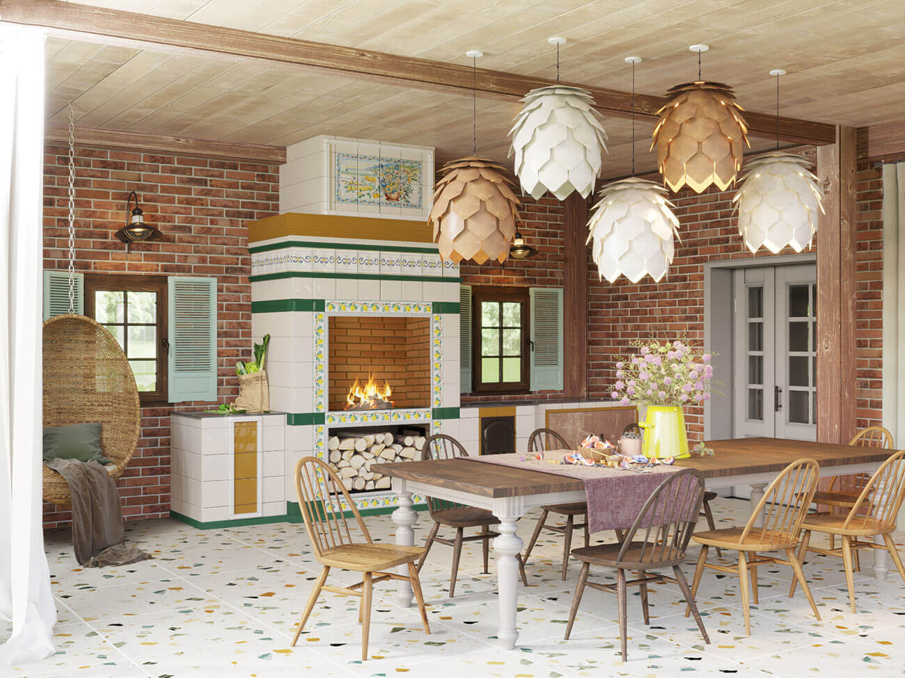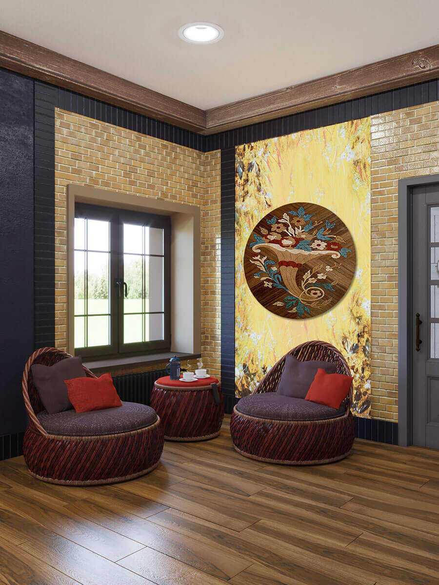 В четкую архитектурную структуру помещений гармонично вписываются плавные решения. Эта гармонизация мужского и женского начал проявляется в сочетании материалов, текстур, дизайнерских приемов. Так, например, натуральные лаконичные оттенки дерева сочетаются с узорной расписной глянцевой керамической плиткой в зоне кухни. Сложный брутальный микс керамогранита под камень в сочетании с утонченным трафаретом из выженных травинок в парной. Строгий терракотовый кирпич с утонченными художественными изразцами в мангальной зоне. Данные приемы позволяют изучать интьерьер, рассматривать, любоваться.