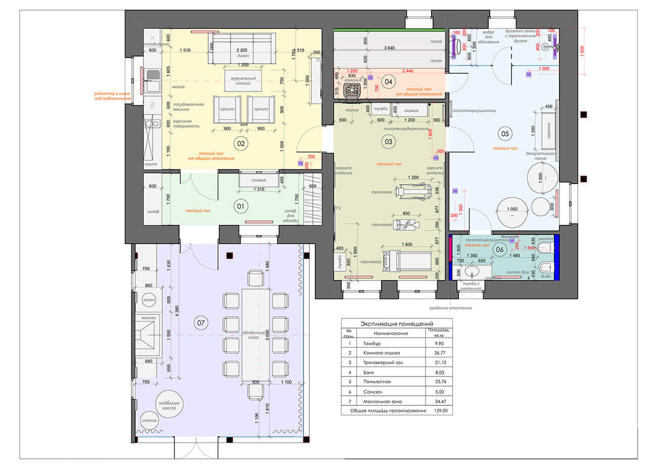Функционально здание имеет три зоны. Зона отдыха начинается на открытой террасе с мангальной зоной, переходит через прихожую в кухню с уютной мягкой зоной. Терраса имеет стеклянное ограждение, которое при желании сдвигается в сторону. Далее следует совмещенная раздевалка с тренажерами, которая ведет в «мокрую зону», где расположился «душ впечатлений», мини-чайная. Отсюда вход в баню и санузел.