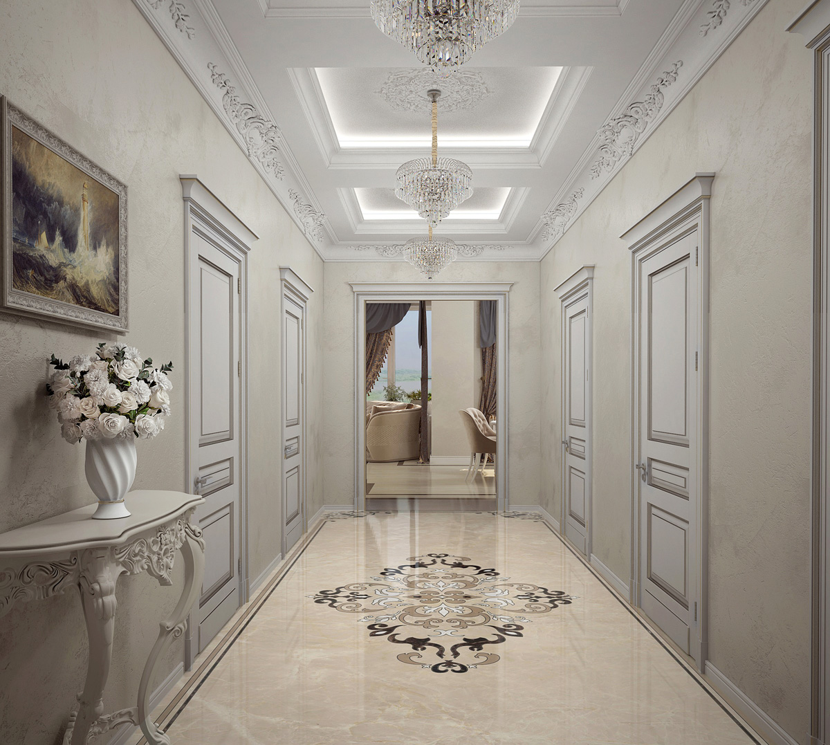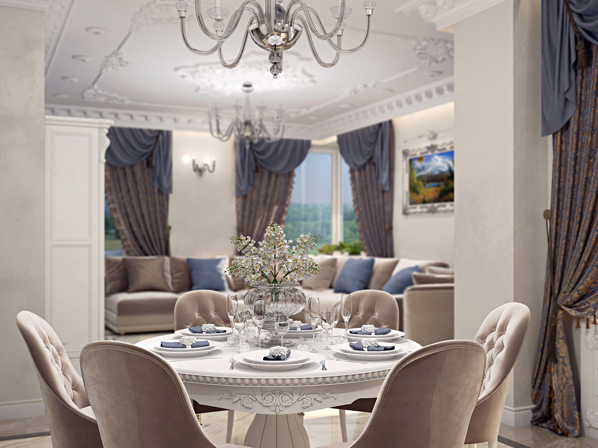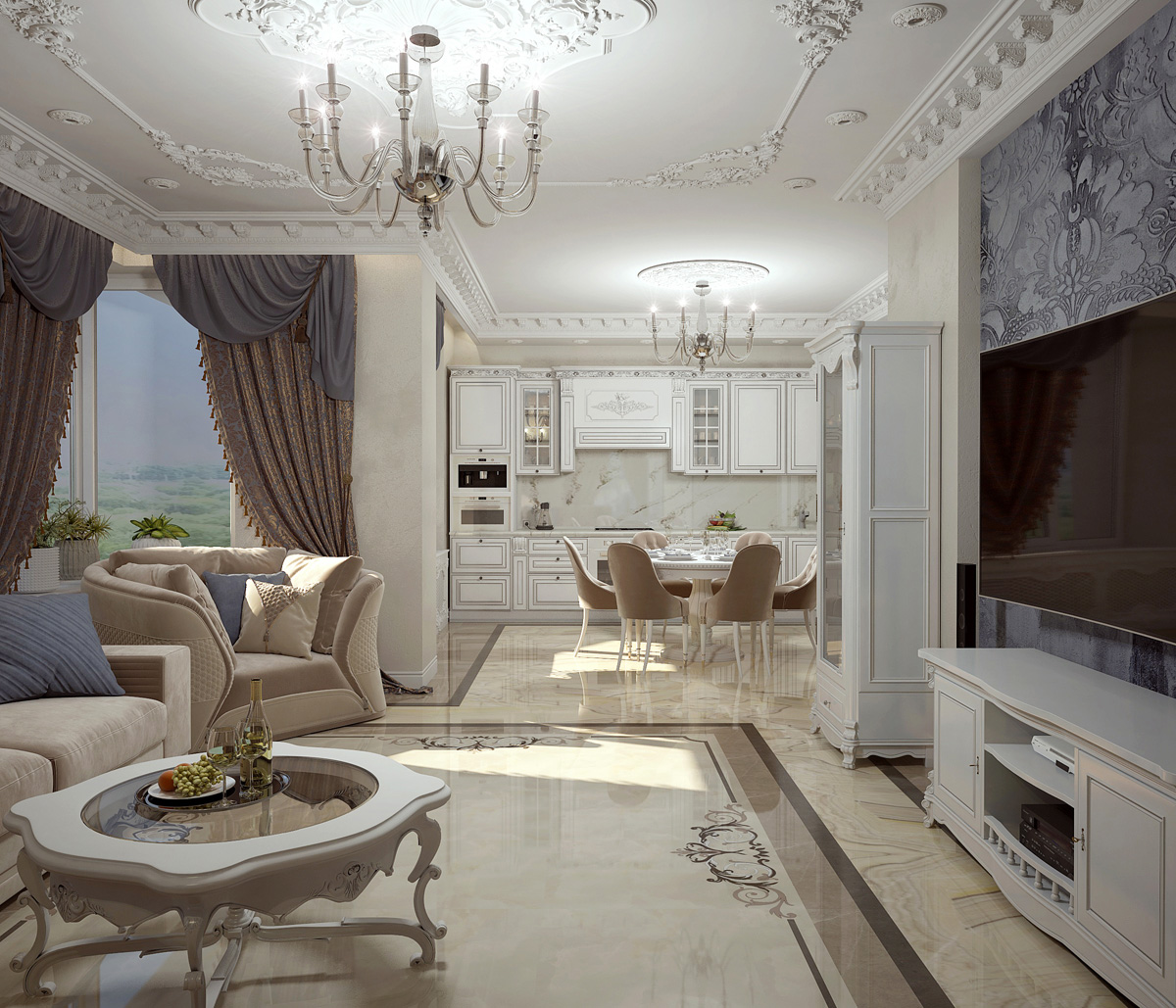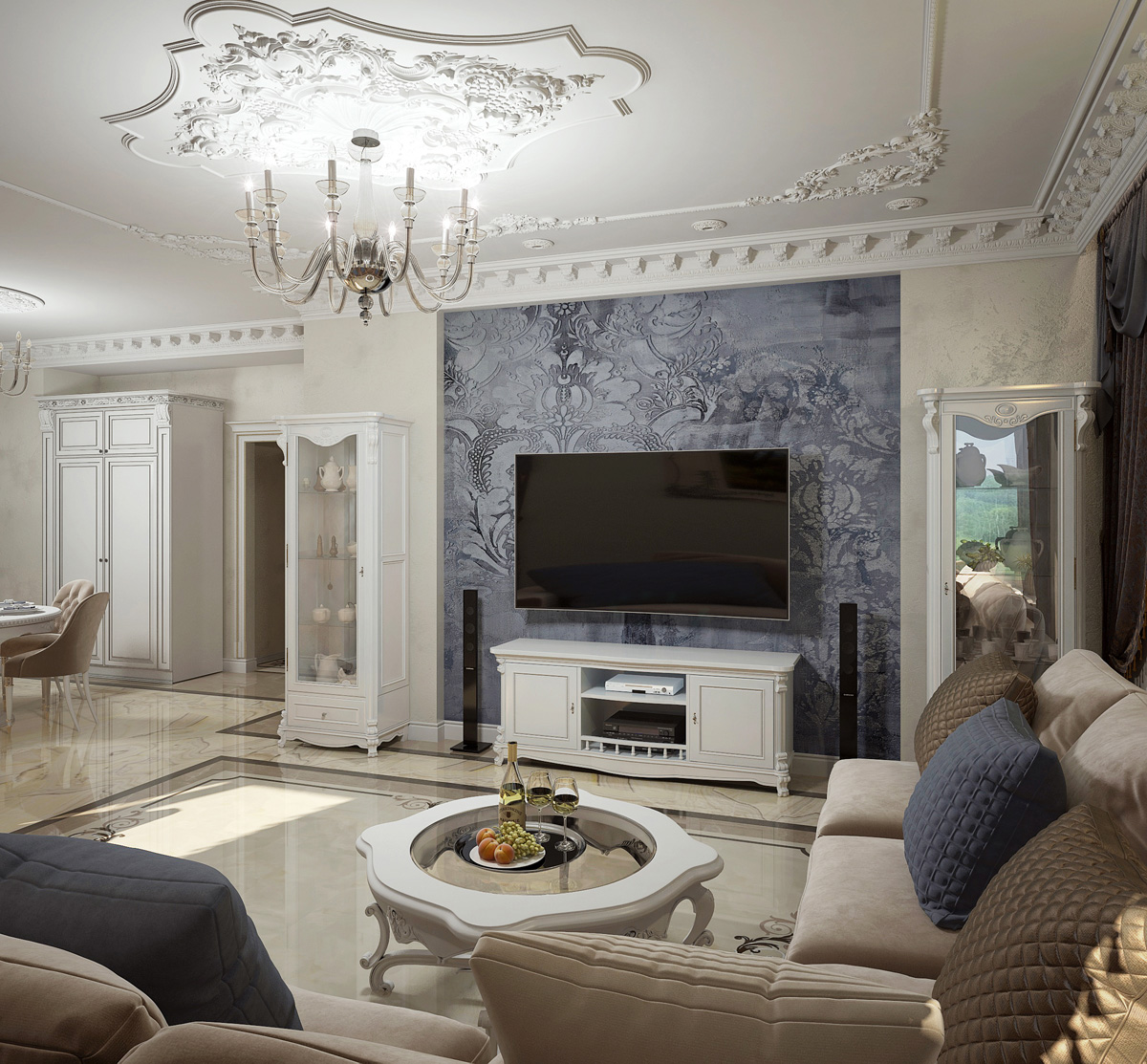 В просторной 4-комнатной квартире главенствует классика, для которой тщательно отбирались различные виды мрамора, декоративные элементы, коллекции мебели, аксессуары, дорогой текстиль. Особую роль в оформлении интерьеров играет и благородная цветовая гамма, в которой сочетаются теплые и светлые оттенки, торжественная белизна и прозрачная голубизна.