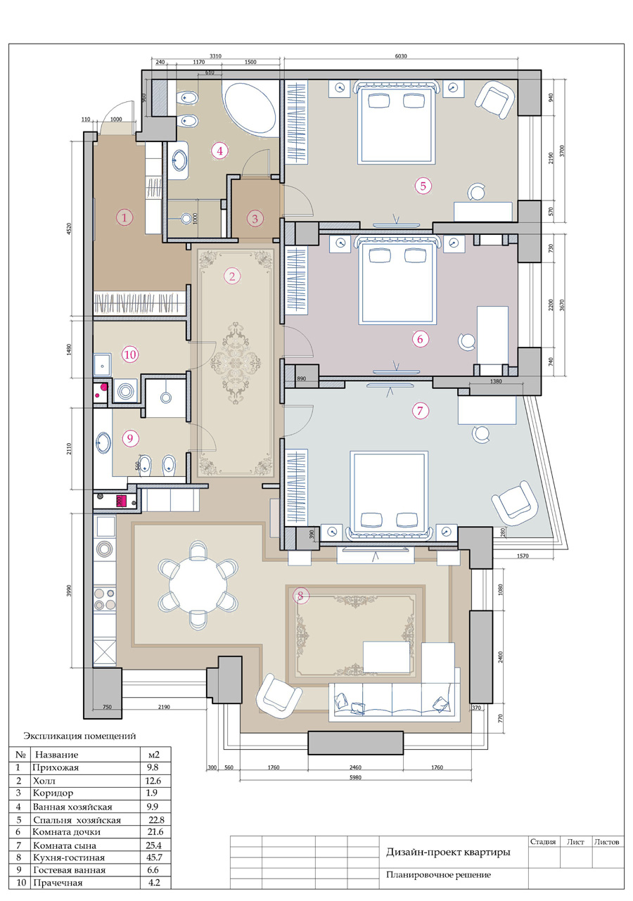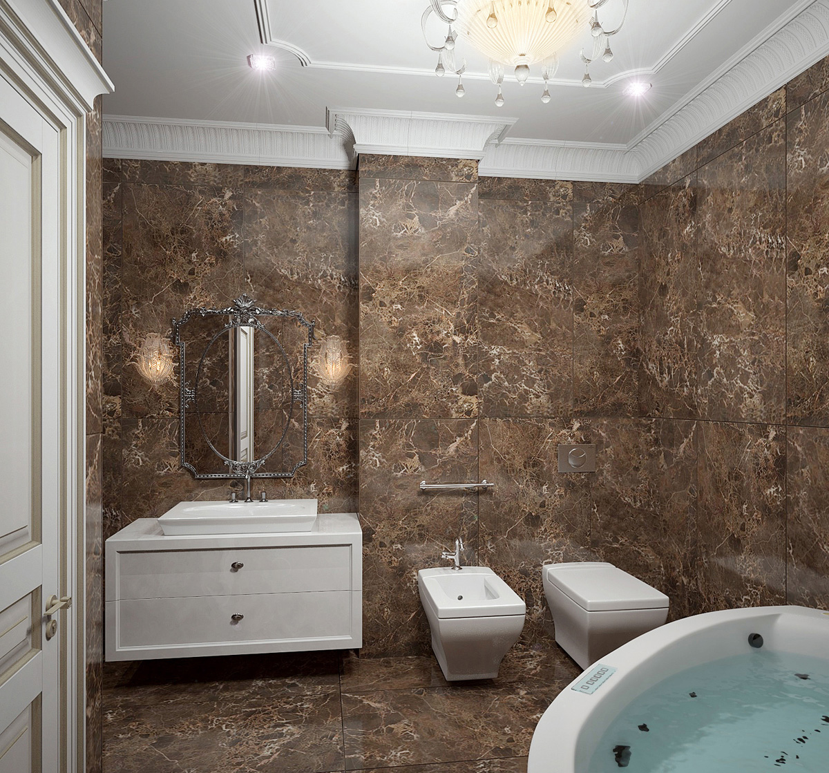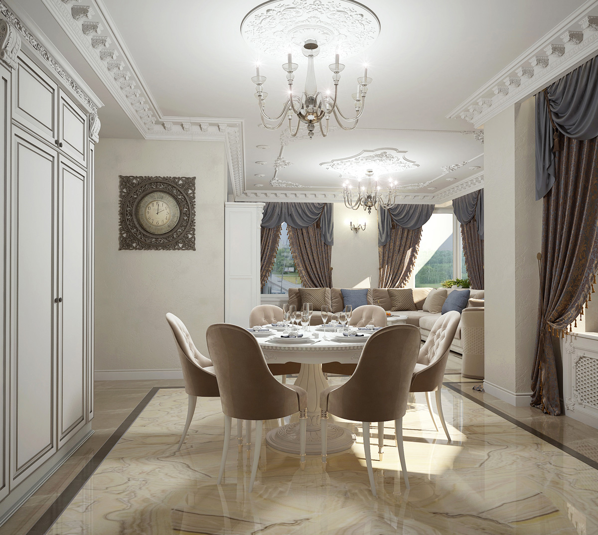 В просторной 4-комнатной квартире главенствует классика, для которой тщательно отбирались различные виды мрамора, декоративные элементы, коллекции мебели, аксессуары, дорогой текстиль. Особую роль в оформлении интерьеров играет и благородная цветовая гамма, в которой сочетаются теплые и светлые оттенки, торжественная белизна и прозрачная голубизна.