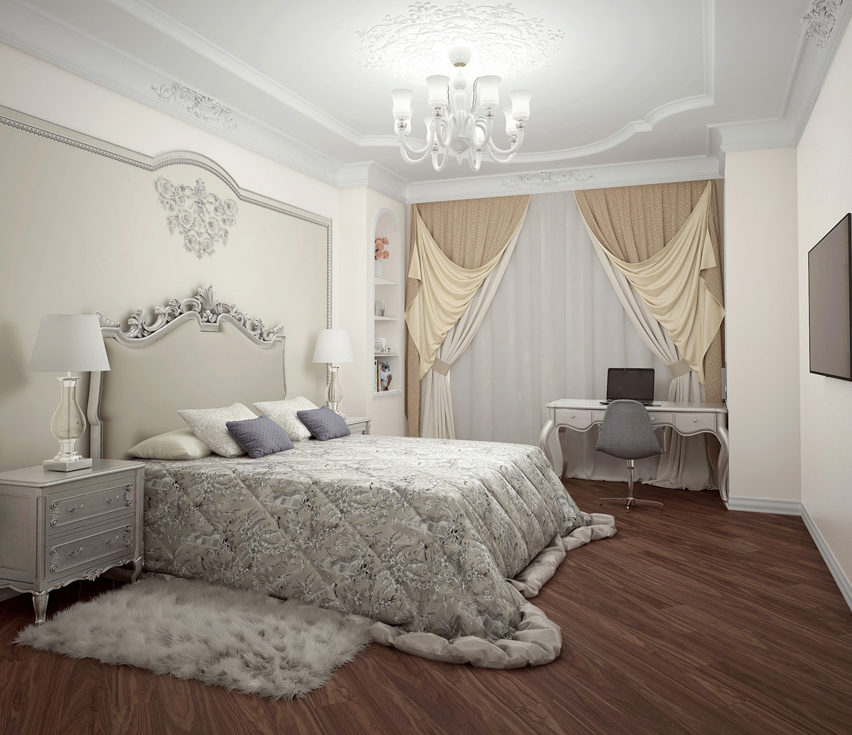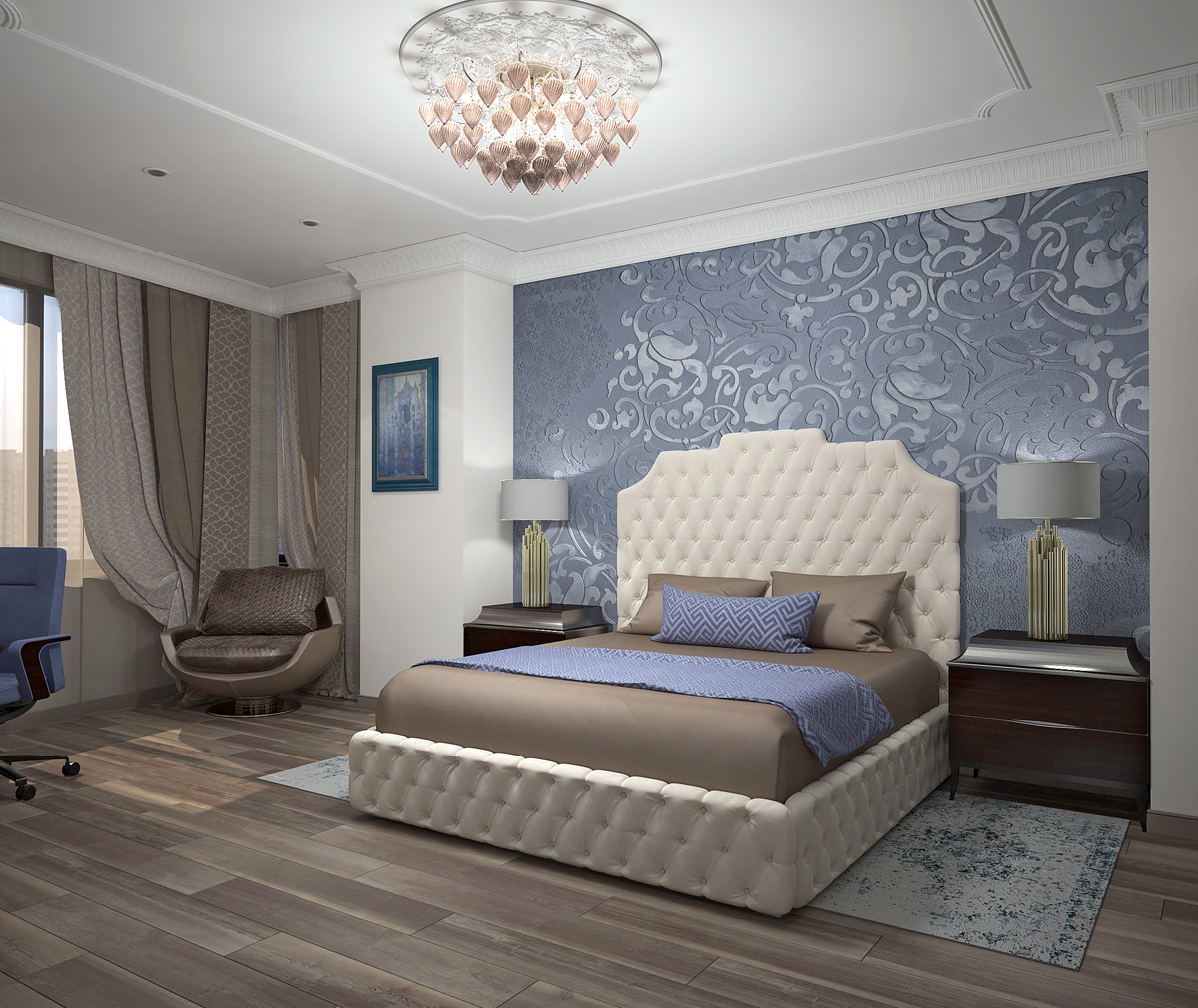 Для каждого помещения подобраны эксклюзивные коллекции лепнины — узорных бордюров и розеток, разработаны эскизы настенных декоров. Эффектным элементом стали и светодиодные подсветки.