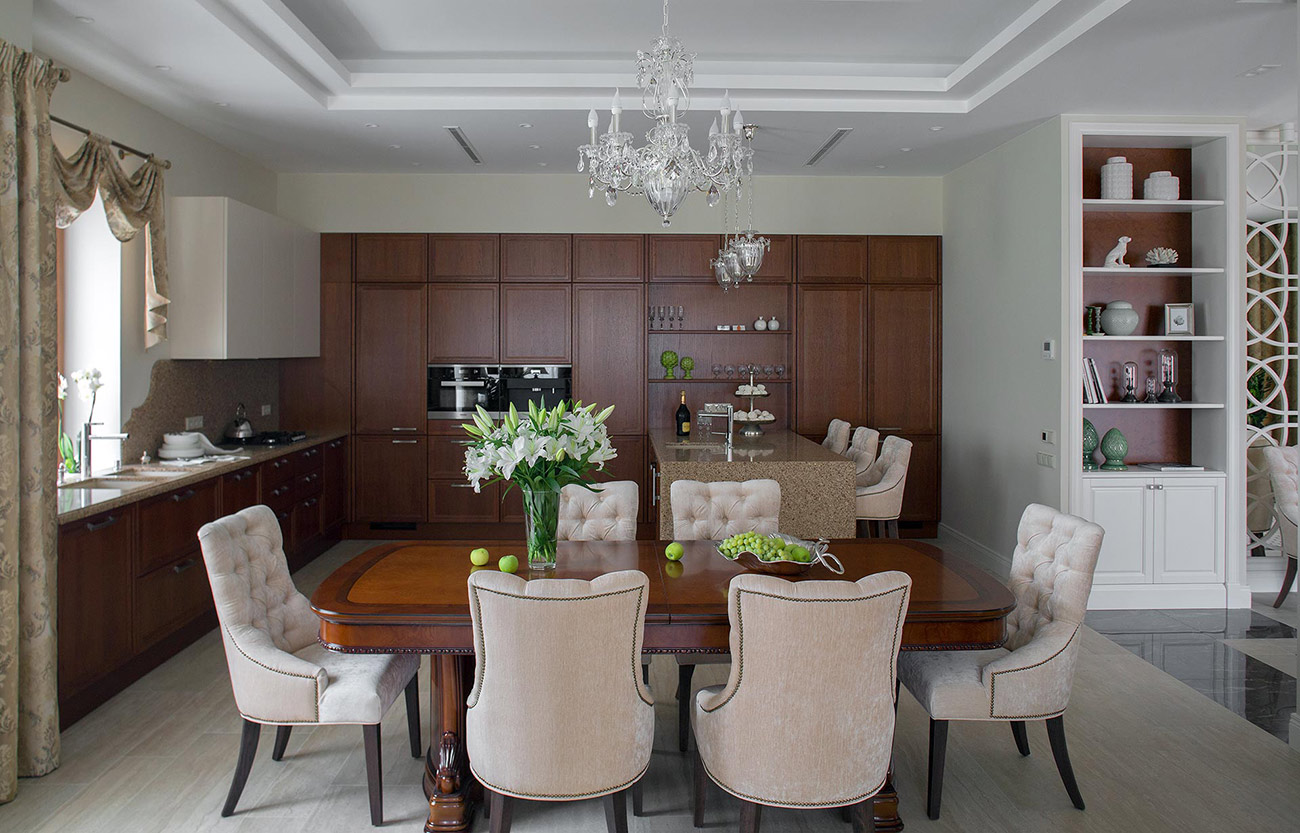 В интерьере загородного дома, расположенного в подмосковном поселке Пестово и созданного для большой семьи с детьми, соединены классические формы и современные решения. Эклектичный стиль с элементами классики останется актуальным и десятилетия спустя, поэтому в доме нет модных аксессуаров или решений, которые устаревают одновременно с воплощением. Помещения выполнены в сдержанной цветовой гамме, построенной на сочетании светлых поверхностей и контрастной по цвету теплой фактуры натурального дерева и камня.