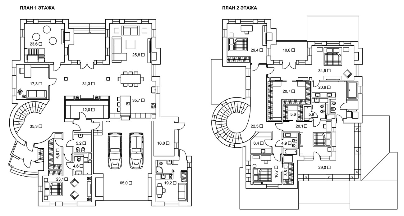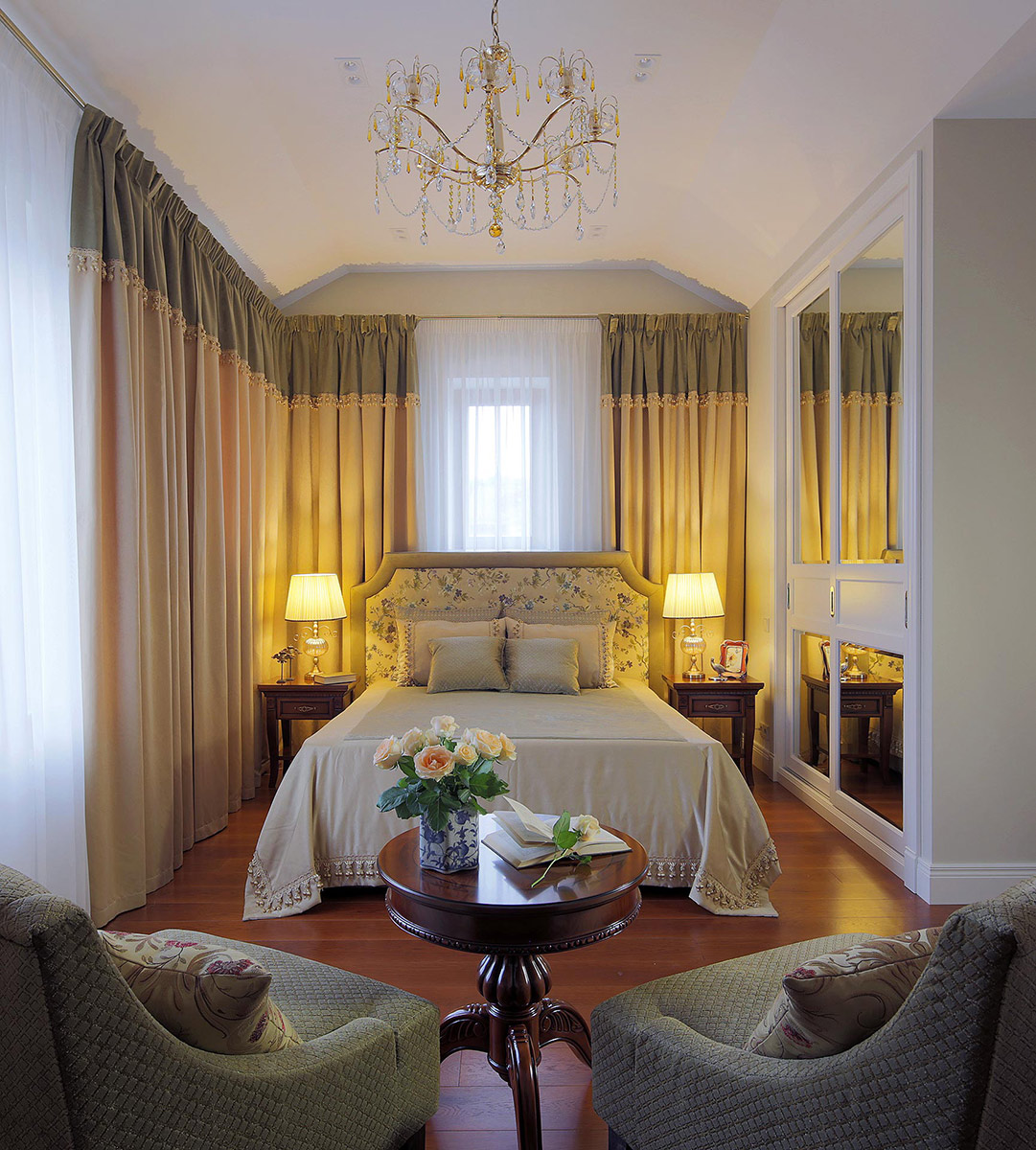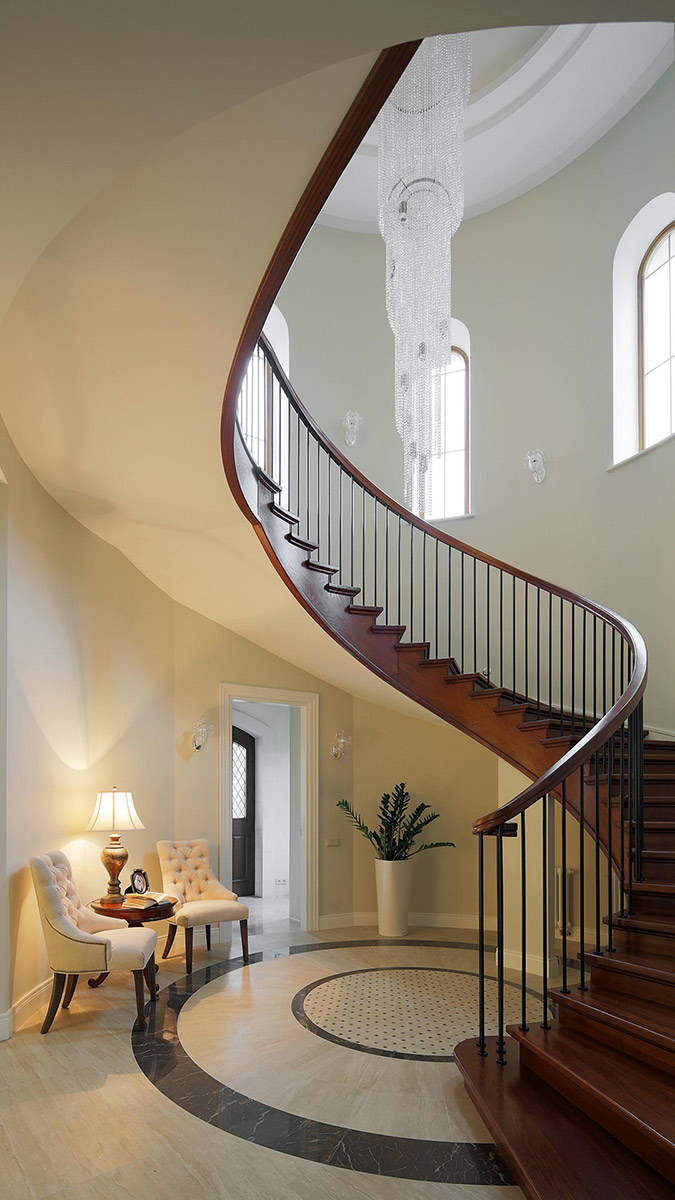 Архитектура дома в итальянском стиле с множеством окон, высокими потолками и свободной планировкой дала полную свободу в зонировании пространства и позволила расположить приватные помещения максимально отдаленно от парадной и гостевой зон. На первом этаже просторное единое пространство гостиной, столовой и кухни перетекает в парадный проходной холл. Здесь же находятся кабинет, детская игровая и гостевая спальня. Приватный второй этаж состоит из спален, гардеробных и ванных комнат. Помещения здесь отличаются сложной конфигурацией потолков, обусловленной многоскатностью крыши.