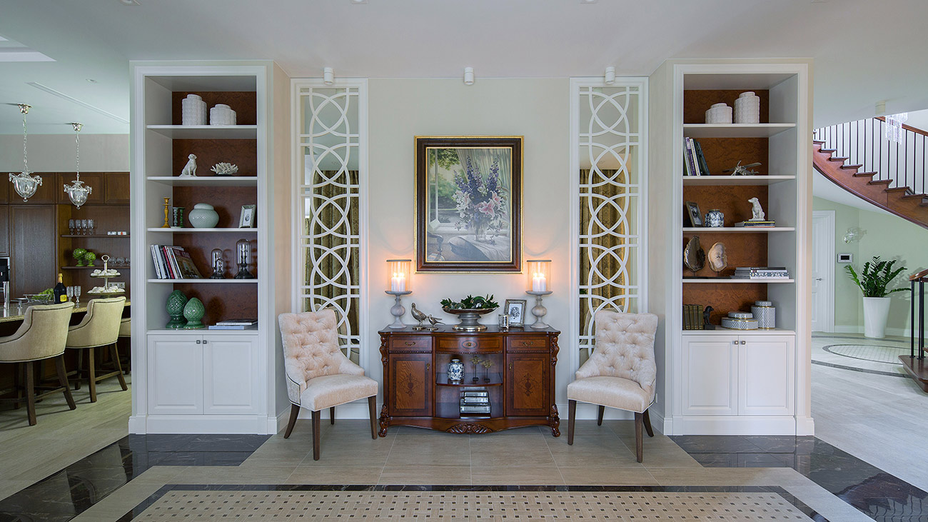В холле классическая композиция с симметричной отделкой и расстановкой мебели создает парадную атмосферу, которую поддерживают старинные подсвечники со свечами, а зеркальные панели с авторским орнаментом придают интерьеру индивидуальность и неповторимость.