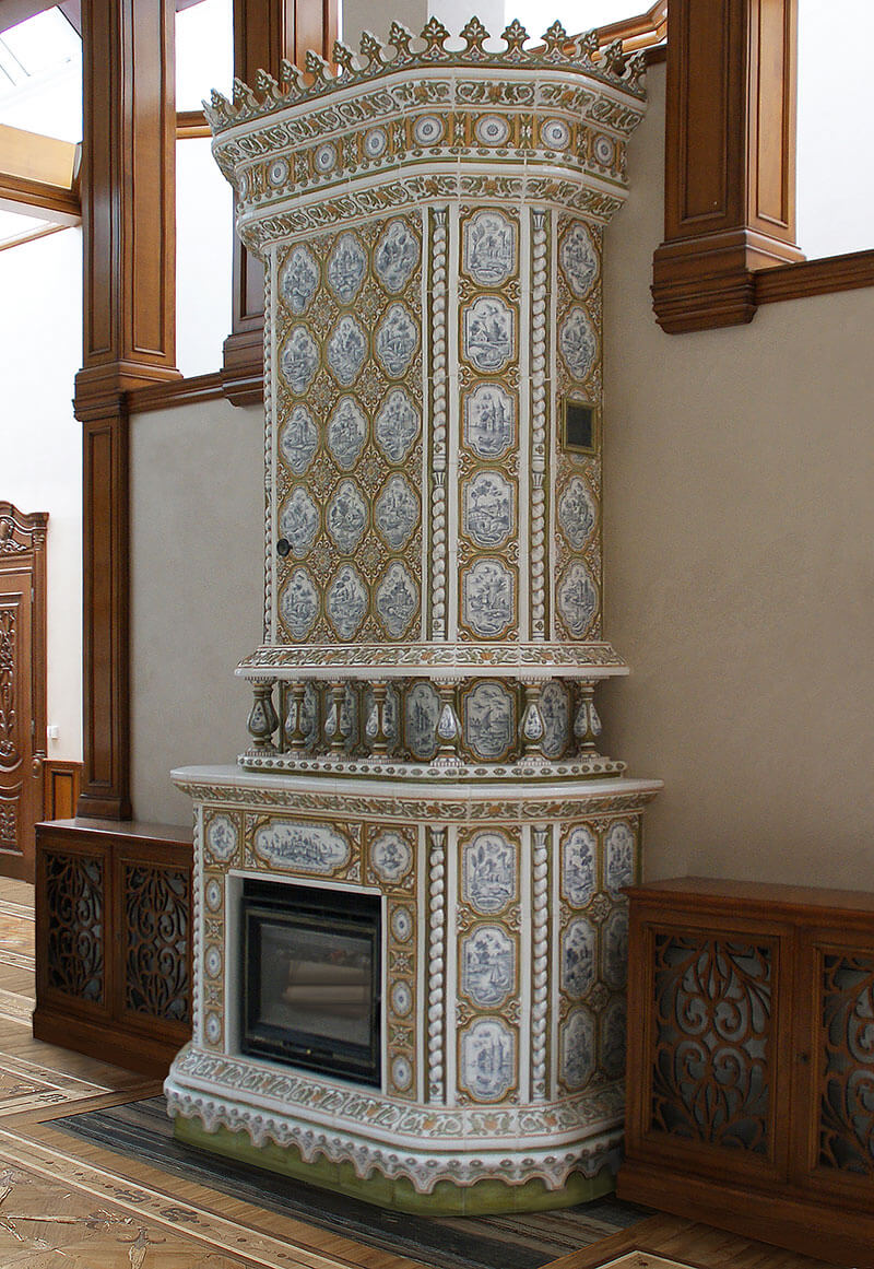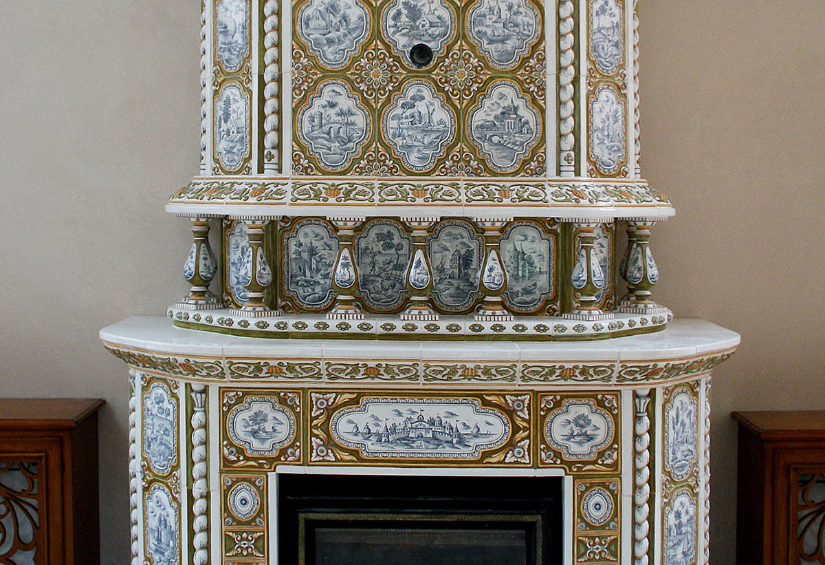 Изразцовый классический камин спроектирован для загородного дома.