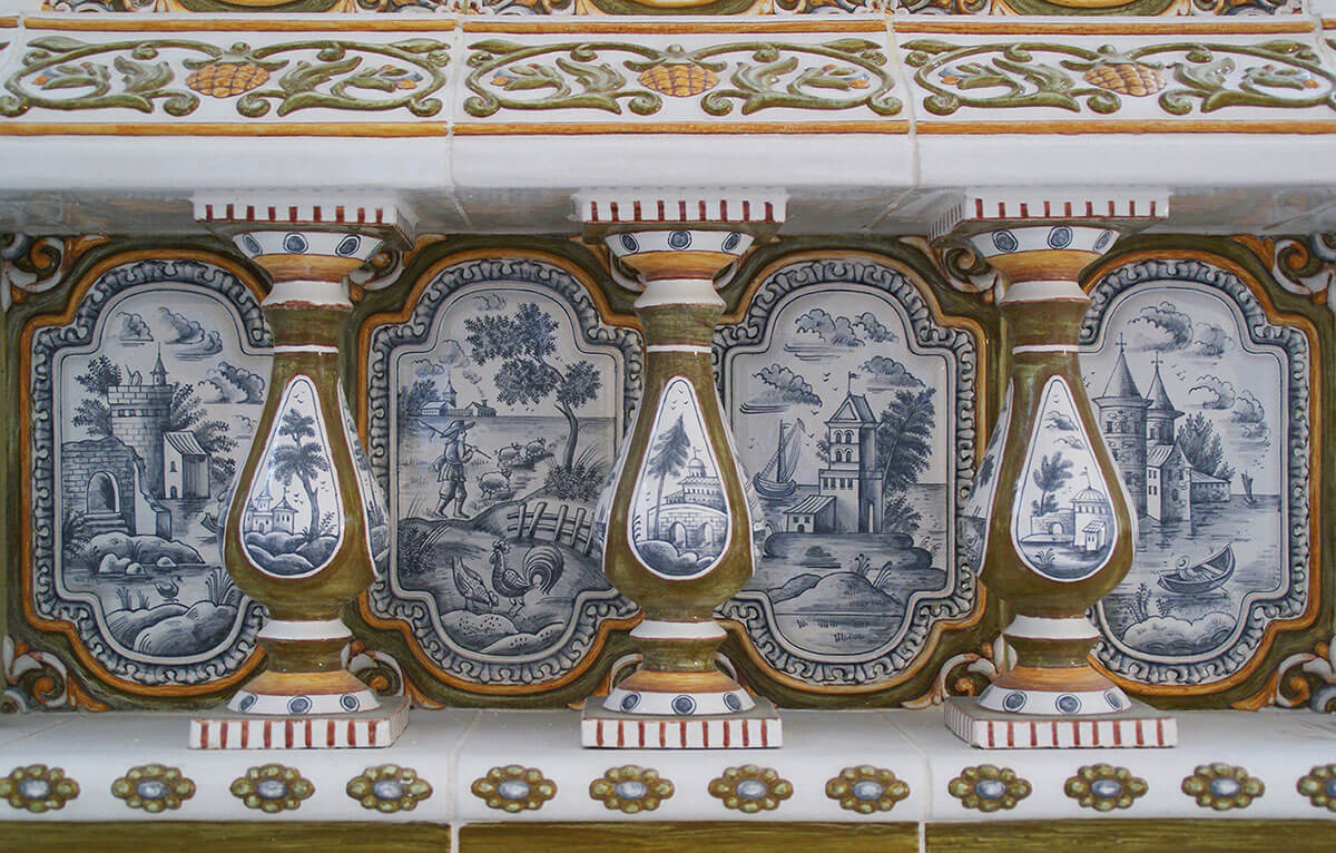 Классические изразцы расписаны в технике подглазурной росписи по белой эмали на тему голландских пейзажей. Однако традиционный для голландских плиток кобальтовый цвет в данном случае был заменен на более сложную полихромную гамму из теплого зеленого и холодного серого цвета с добавлением желтого и коричневого оттенков.