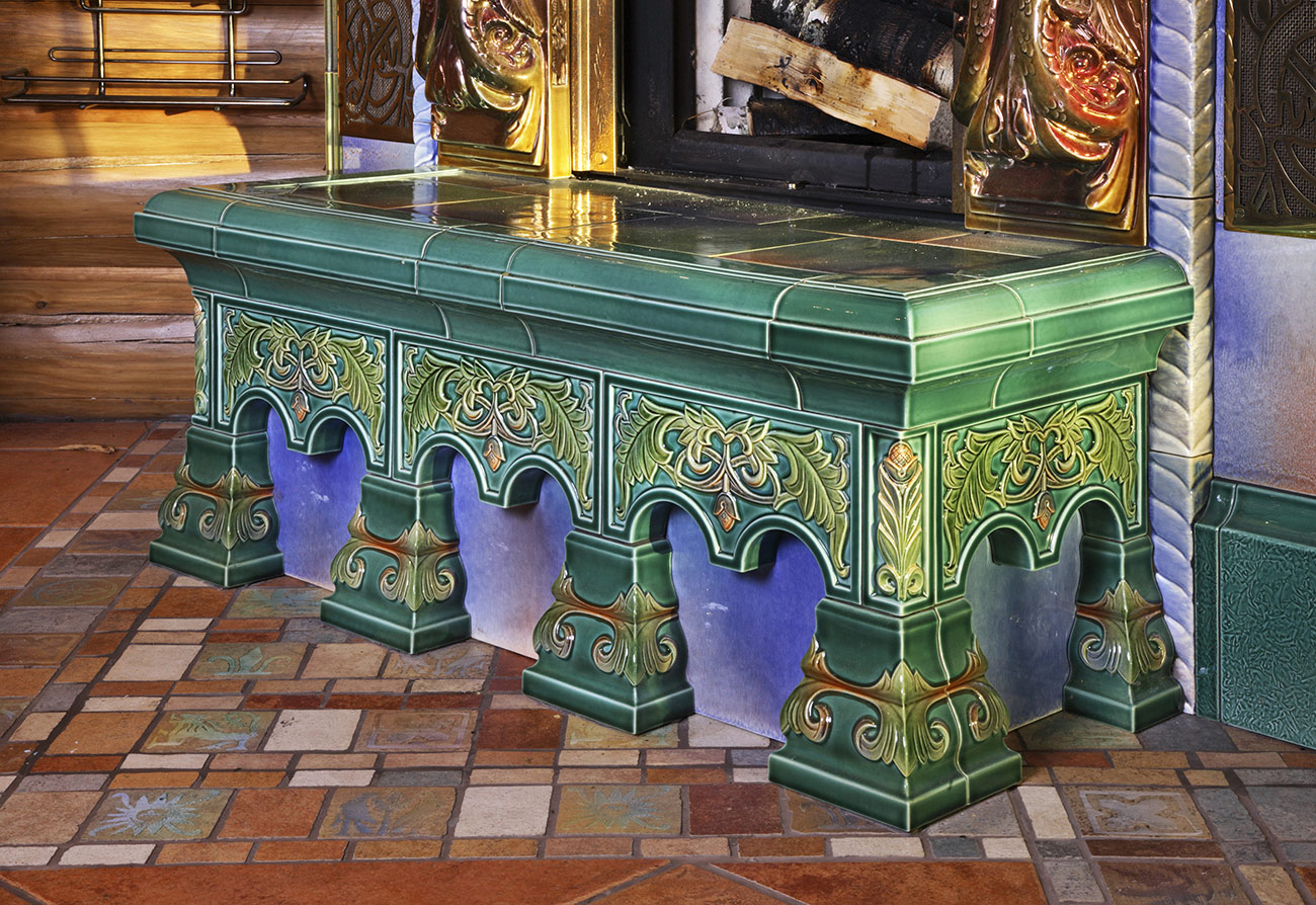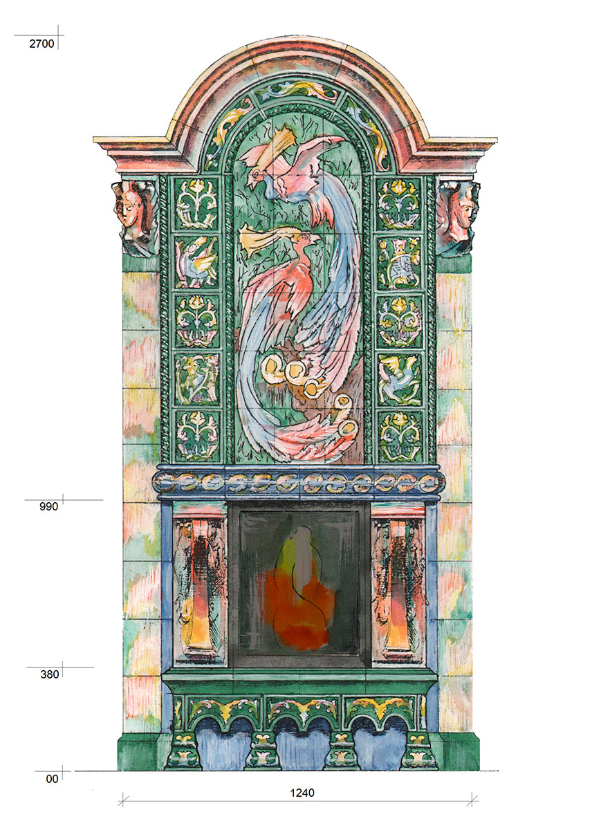 Низ камина оформлен подиумом и изразцами — «арочками» и «ножками». Конвекционные решетки с прорезным силуэтом ящерицы спроектированы авторами проекта по мотивам изразцов М.А. Врубеля.