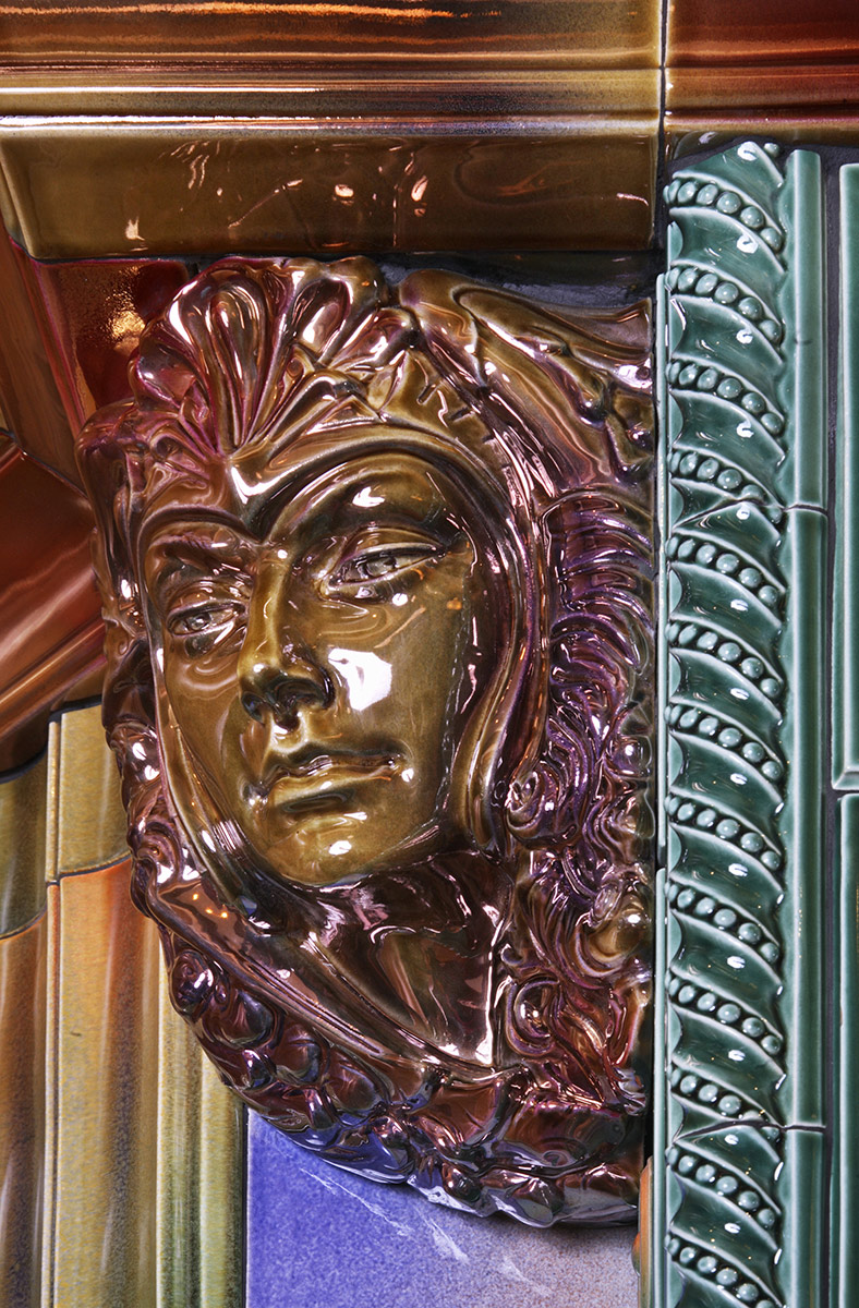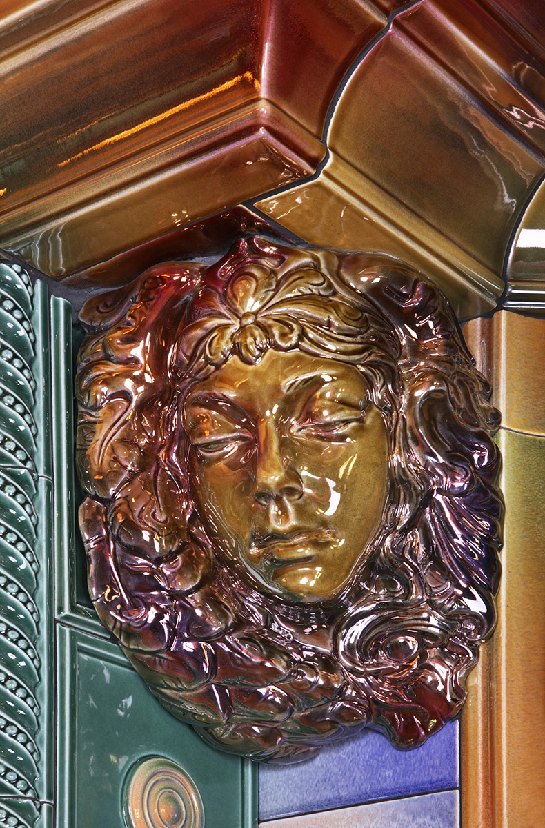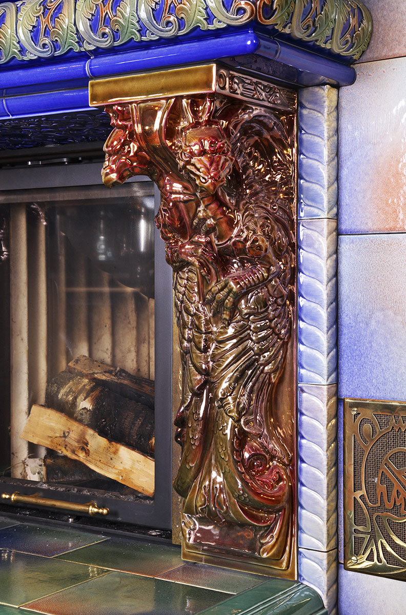 Камин декорирован насыщенными цветными легкоплавкими поливами авторской разработки. Панно выполнено в технике заливок многослойными лессирующими легкоплавкими глазурями в рамках высокотемпературной перегородки. Изразцовый карниз в виде арки, скульптуры и керамический кронштейн с грифонами покрыты керамическими красителями по уникальной технологии металлизации.