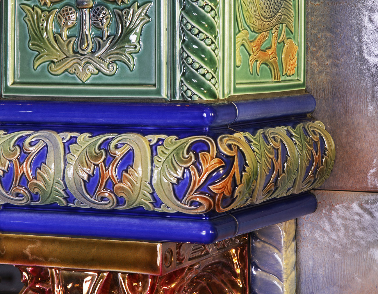 Широкий изразцовый пояс декорирован методом напыла цветными глазурями по легкоплавкой глазури на синем фоне тугоплавкой глазури.