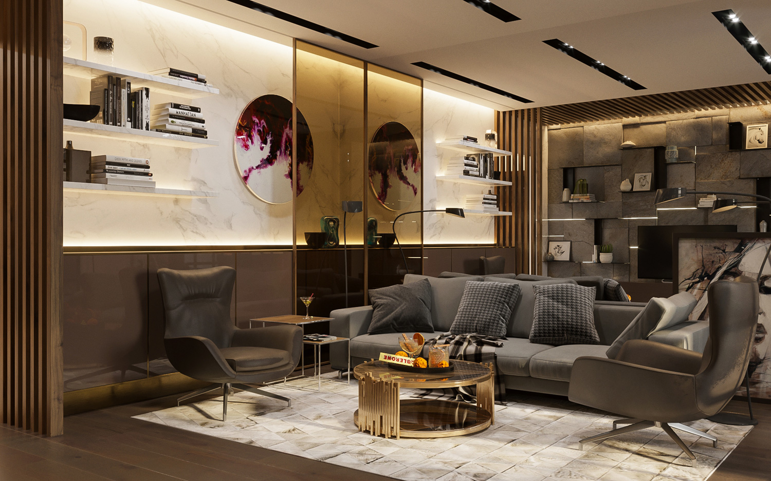 В гостиной достаточно грубая форма натурального камня Artesia Bronze отлично сочетается с глубоким оттенком деревом и светлым мрамором Bianco Carrara Gioia.