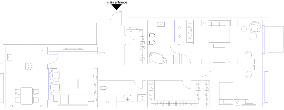 Чтобы не загромождать стену массивными полками и стеллажами, были разработаны плоские металлические вставки, которых практически не видно с фасадной части. Для спальни — практически плоские панели, что значительно легче смотрится.