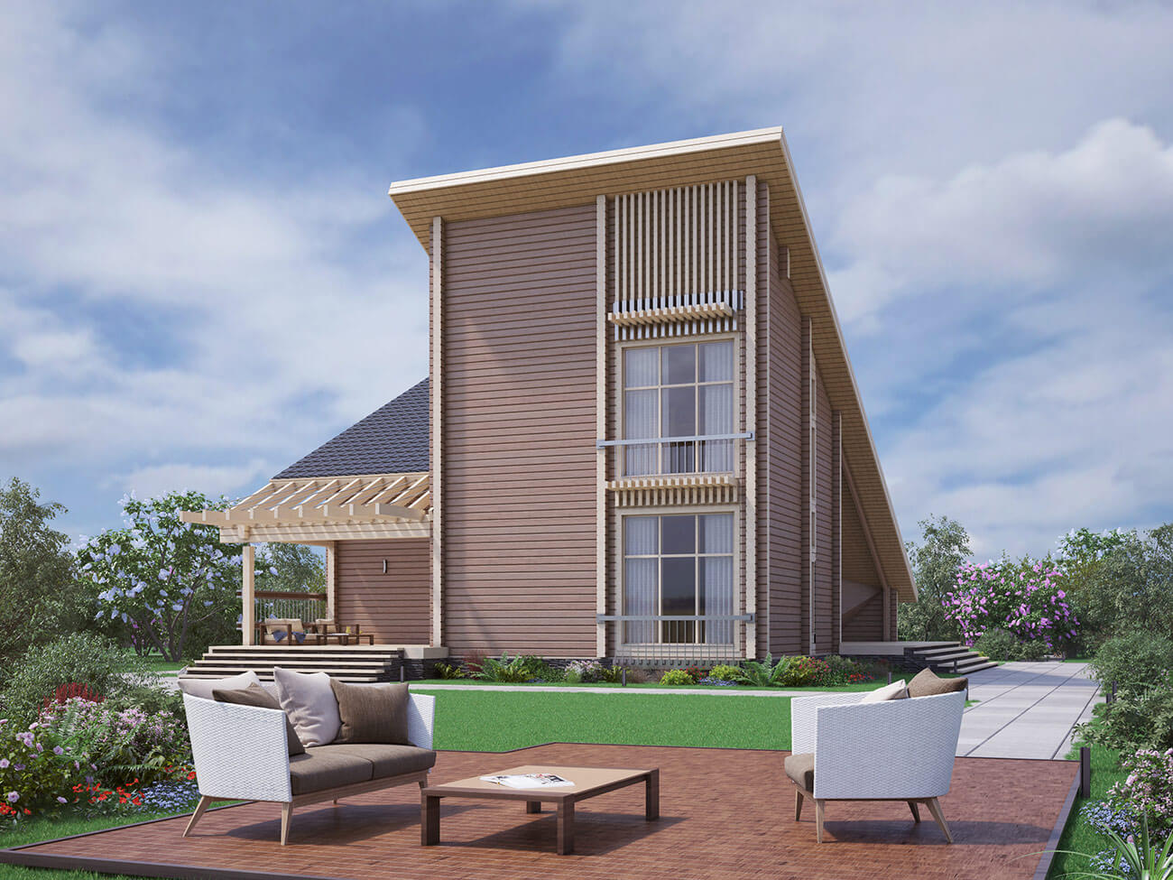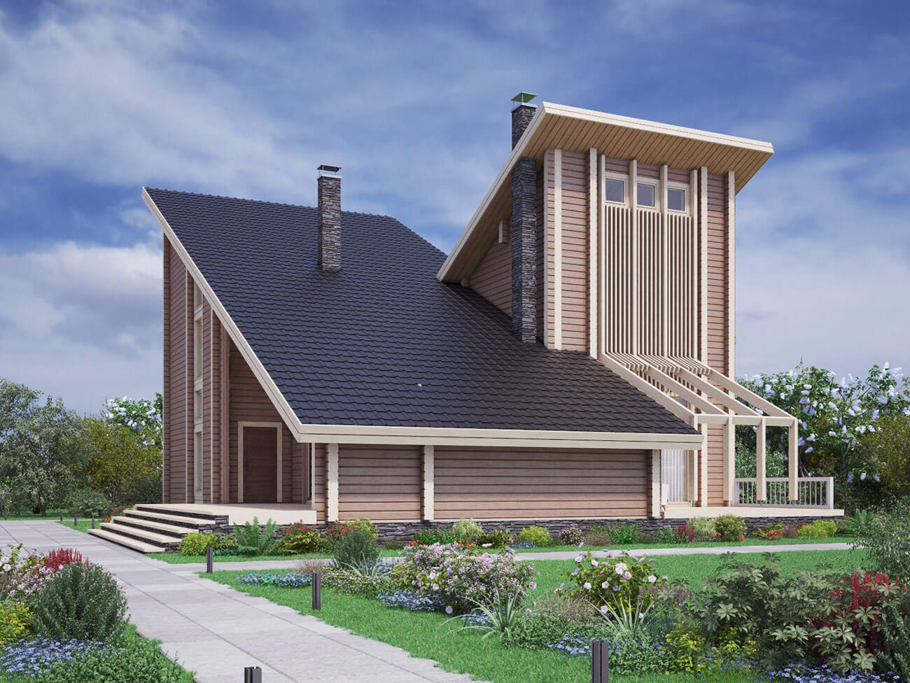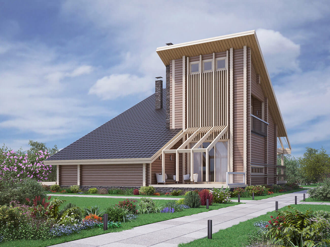 Архитектурный стиль дома ярко подчеркивает декоративная отделка фасадов из клееных конструкций.