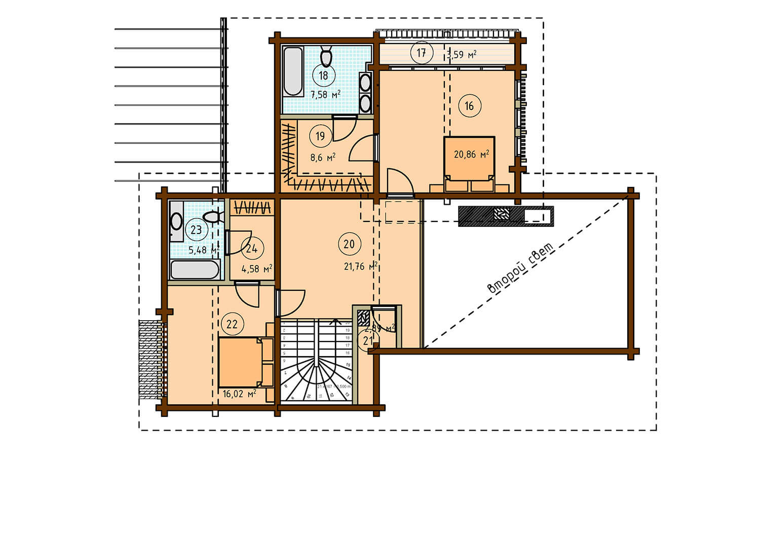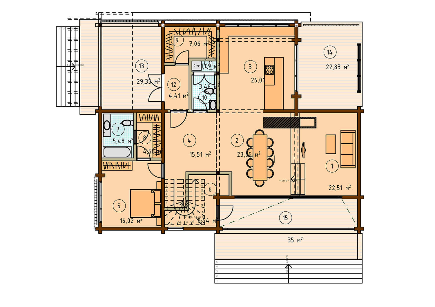 Планировка дома разработана с учетом расположения зон для комфортного проживания одной семьи из трех человек. с возможностью приема гостей. На первом этаже есть просторная комната с своим санузлом и гардеробом, которую можно использовать как удобную гостевую спальню. Кухня 26 кв.м в летнее время объединена с отдельной террасой 23 кв.м и предоставляет хозяевам внушительное пространство для размещения большой компании гостей. Столовая с гостиной разграничены только подиумом, это позволяет четко определиться с зонами, сохранив одно общее пространство, где много воздуха и света от больших витражных окон второго света. Поднявшись на второй этаж, сразу попадаем на хорошо освещенную просторную площадку второго света. Обе спальни этажа имеют собственный гардероб и санузел. Из хозяйской спальни можно выйти на балкон.