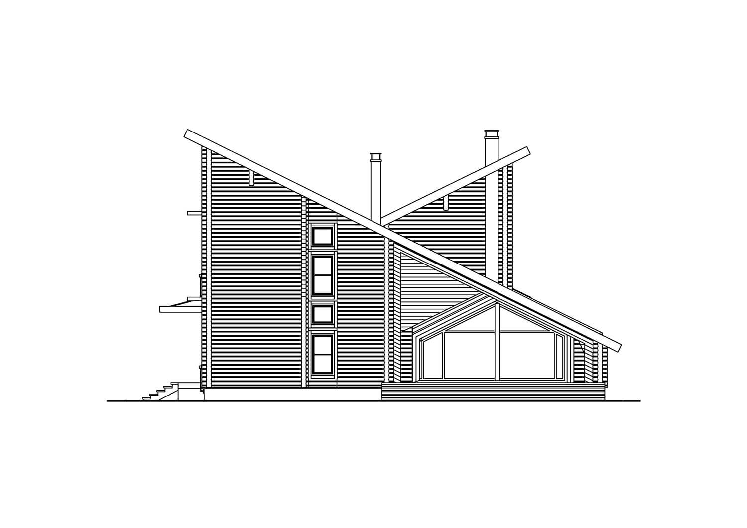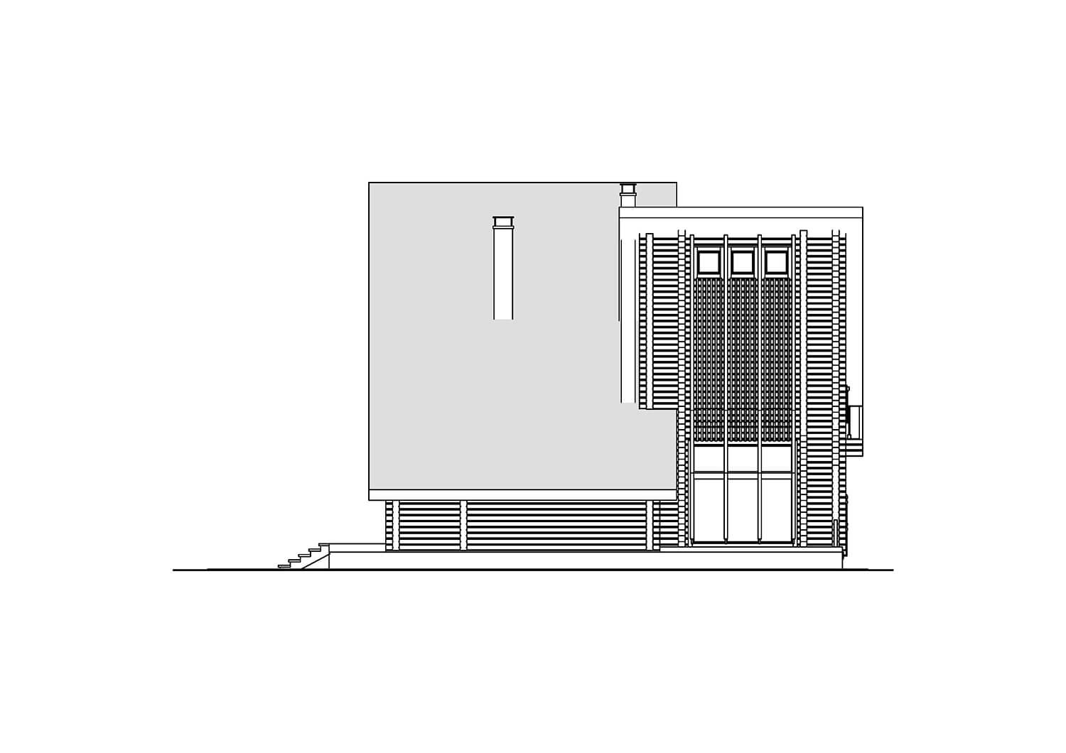 Форма дома представляет собой две разные прямоугольные трапеции, направленные в противоположные стороны. Пропорционально совмещенные, эти две части образуют целостную композицию, интересно вписывающуюся в современно оформленный ландшафт.