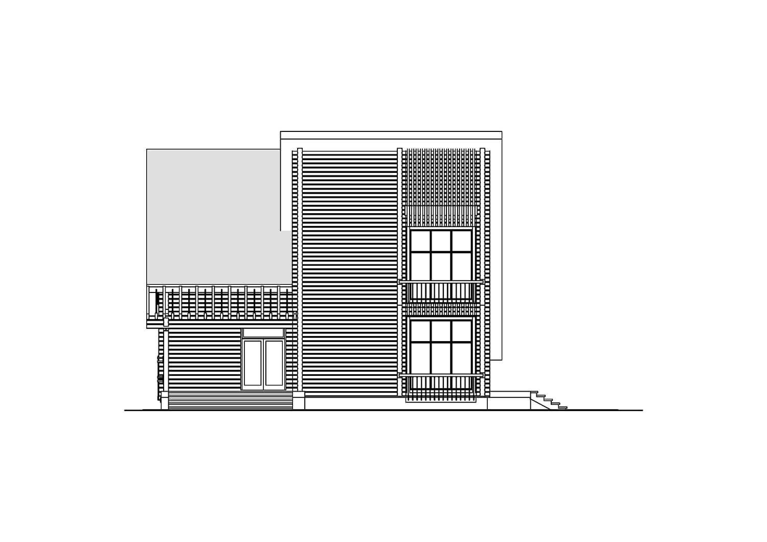 Особенностью проекта можно назвать его неповторимый внешний вид, подчеркнутый специально изготовленными декоративными конструкциями. Верное соотношение вертикальных и горизонтальных элементов, а также двух длинных скатов крыш особенно ярко выделяют дом, но при этом позволяют ему оставаться нейтрально вписанным в общий архитектурный облик поселка.