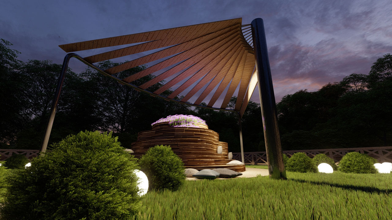 Внутри сада расположена волнообразная лавочка с разными уровнями. На ней можно спокойно отдохнуть в тени и просматривать всю красоту сада наслаждаясь запахом цветов Обриеции.