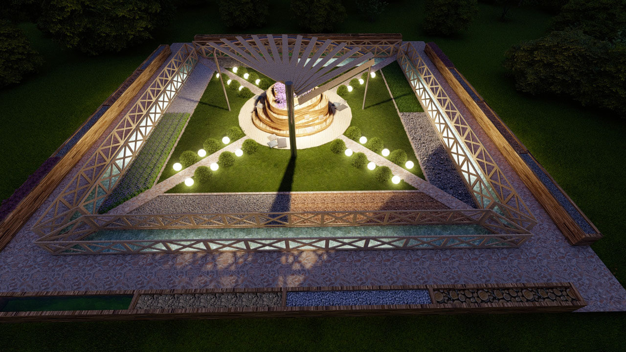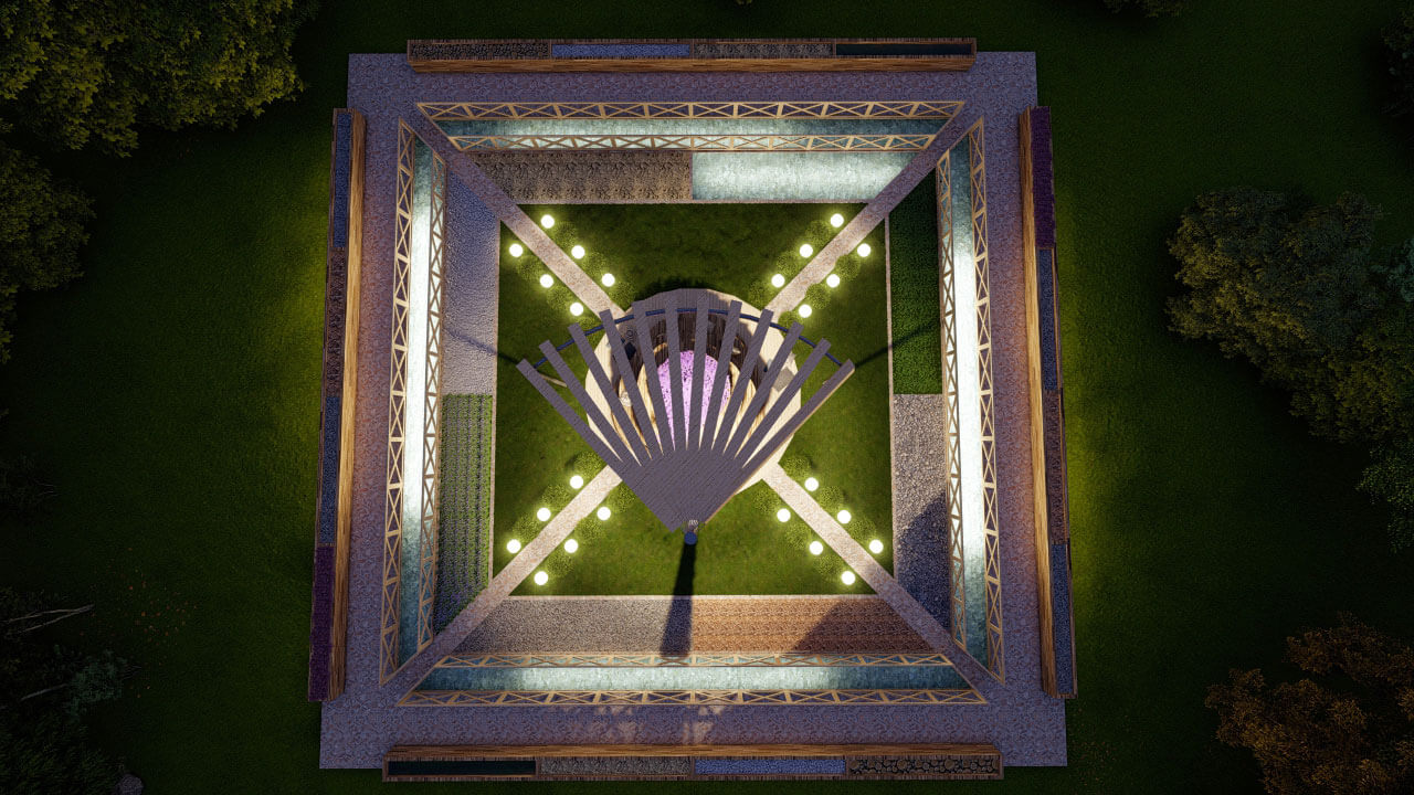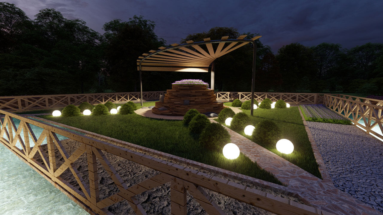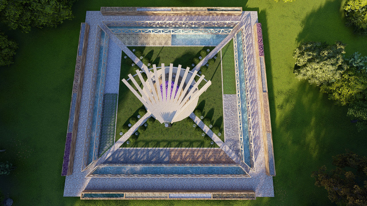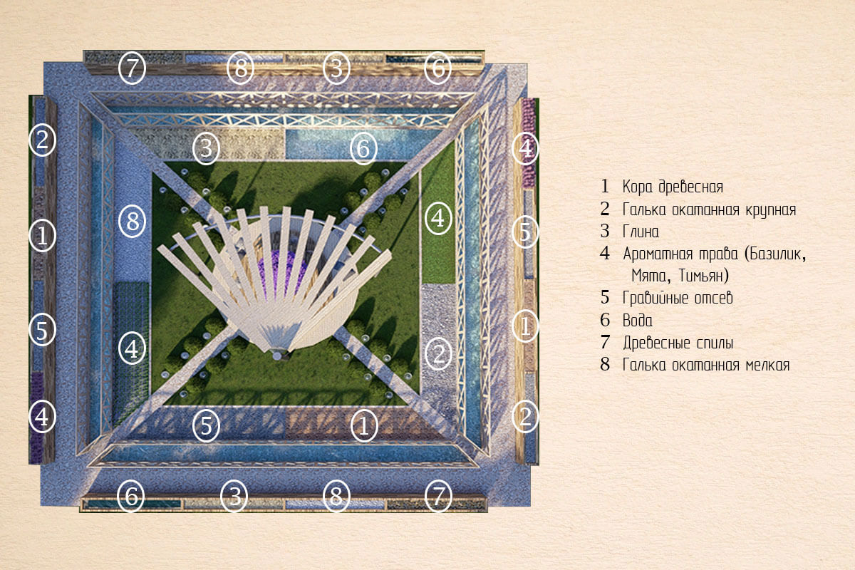 По периметру сада расположены множество блоков с разным наполнением. Они не имеют большую высоту, поэту все смогут спокойно прочувствовать руками разные текстуры. Рядом с блоками пролегает ручей, шум воды положительно влияет на эмоции человека.